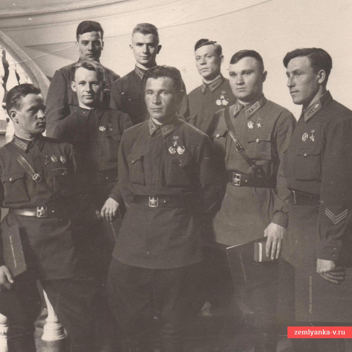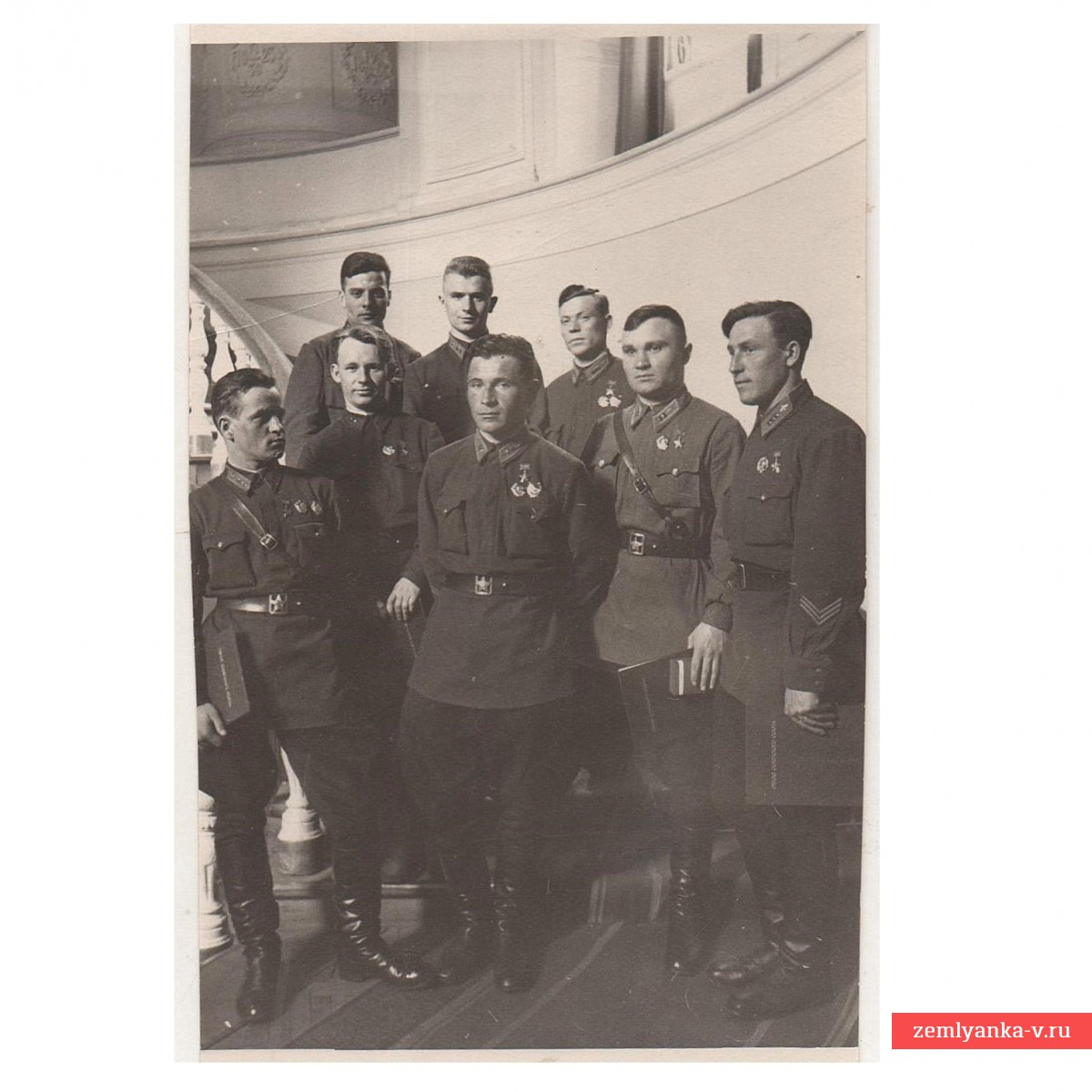 An original and extremely good picture in excellent collector's condition. The photo shows at least 6 characters. The picture was probably taken immediately after the award ceremony. The reverse side is signed with the names of the awardees. The size is 77*118 mm. Guarantee of authenticity.