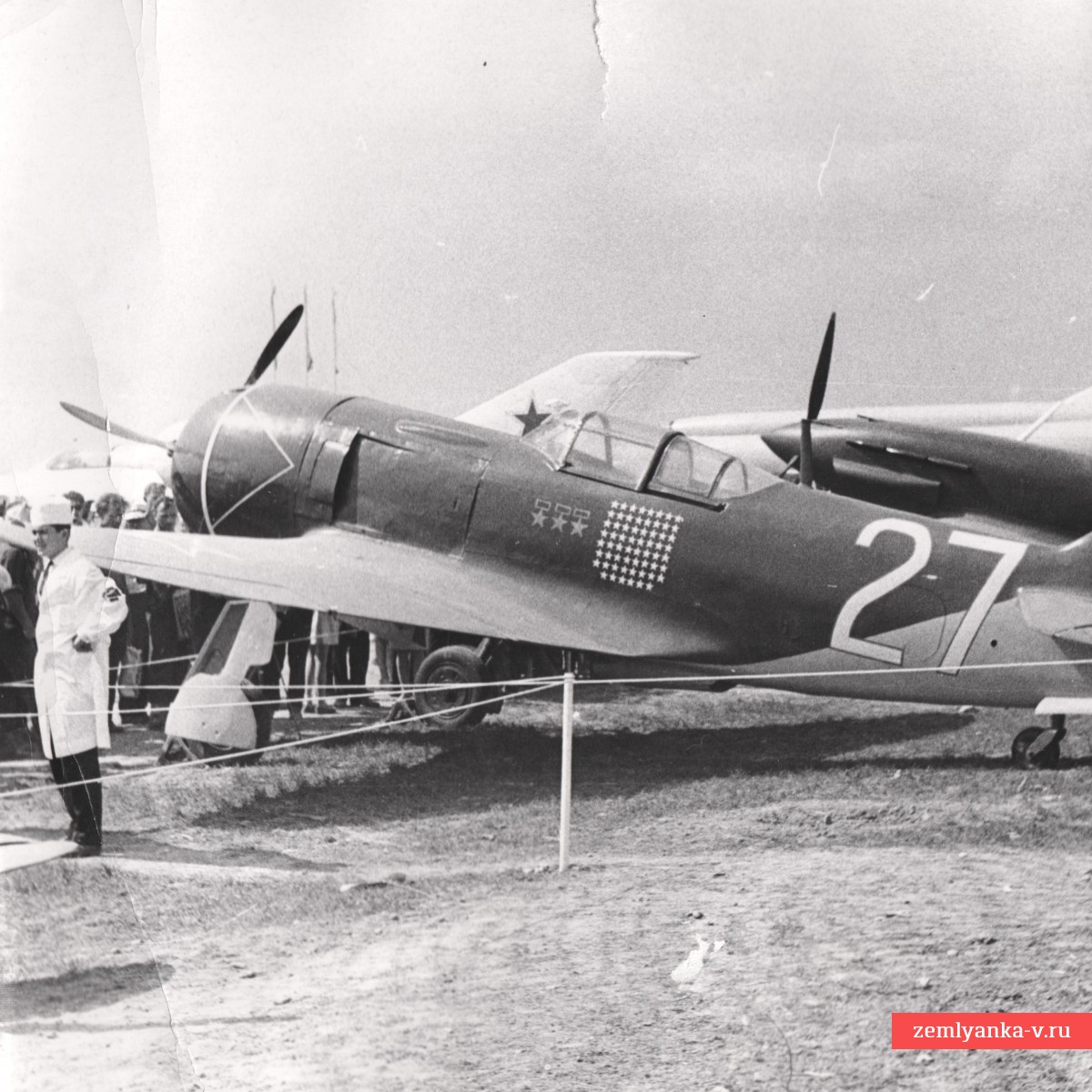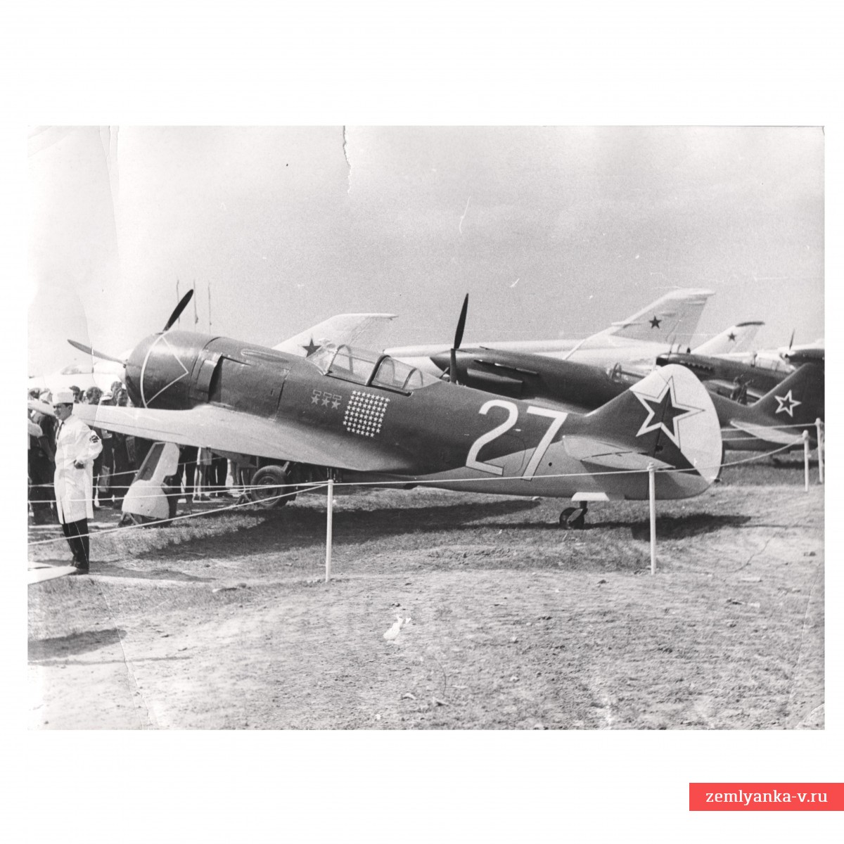 The original post-war photograph, which shows the aircraft with tail number 27, on which the three-time Hero of the Soviet Union I. Kozhedub ended the war. Today, the aircraft is in a museum in Monino. It was on this aircraft that the ace pilot shot down 16 of the 62 enemy aircraft. The size is 183*240 mm. Guarantee of authenticity.