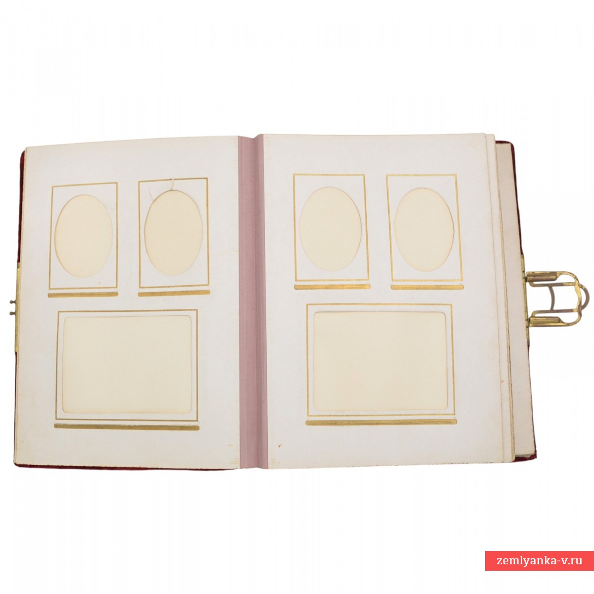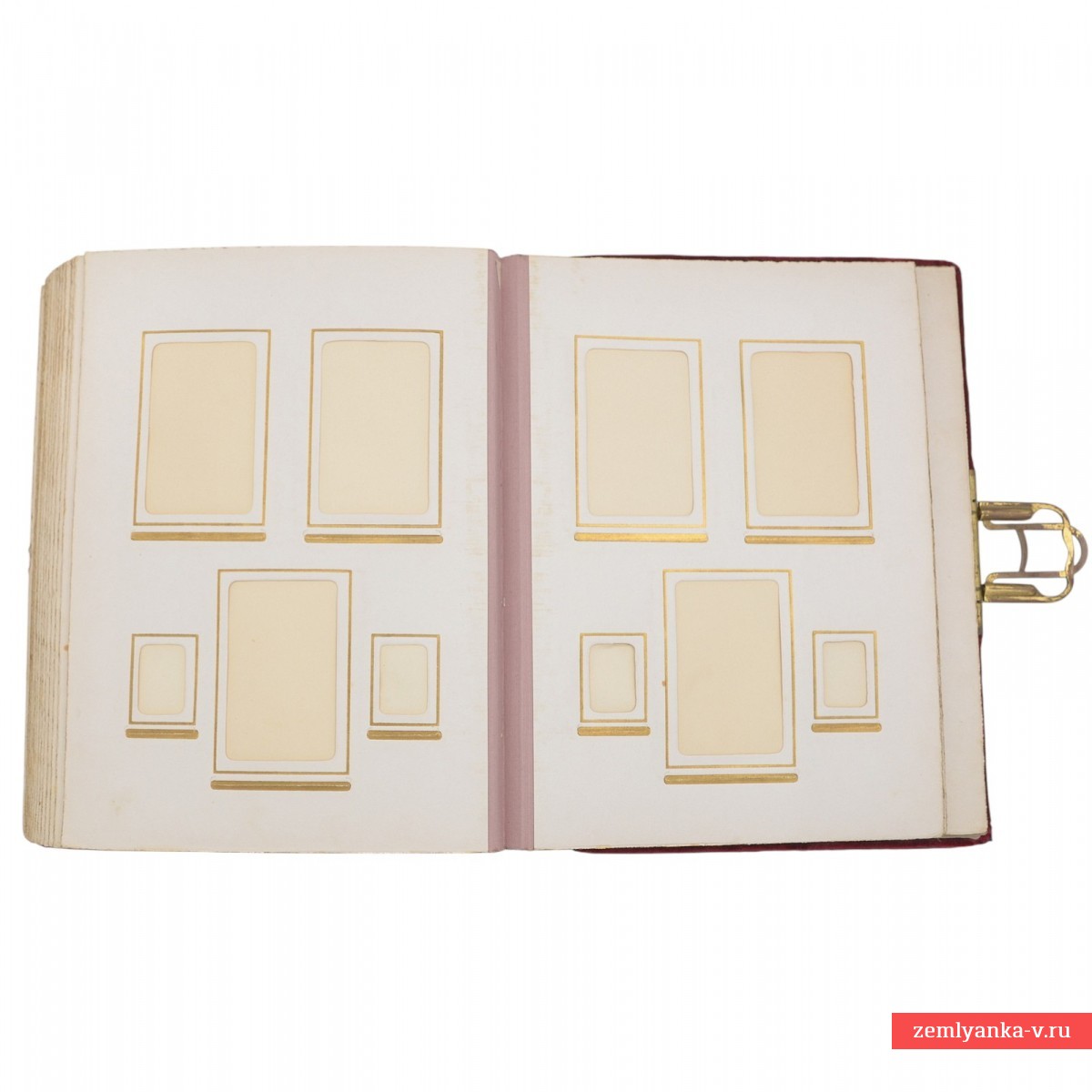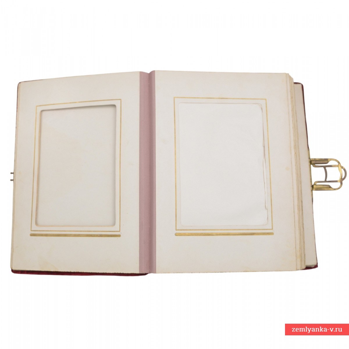 The original photo album is in very good condition. It includes cells for photos of various formats. The size of the sheets is 190*270 mm. The hardcover is covered with velvet. The golden edge of the pages. Guarantee of authenticity.