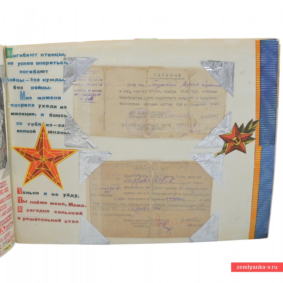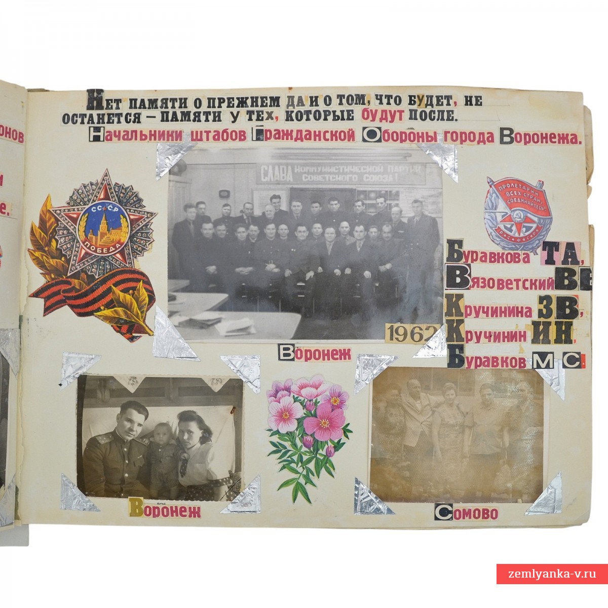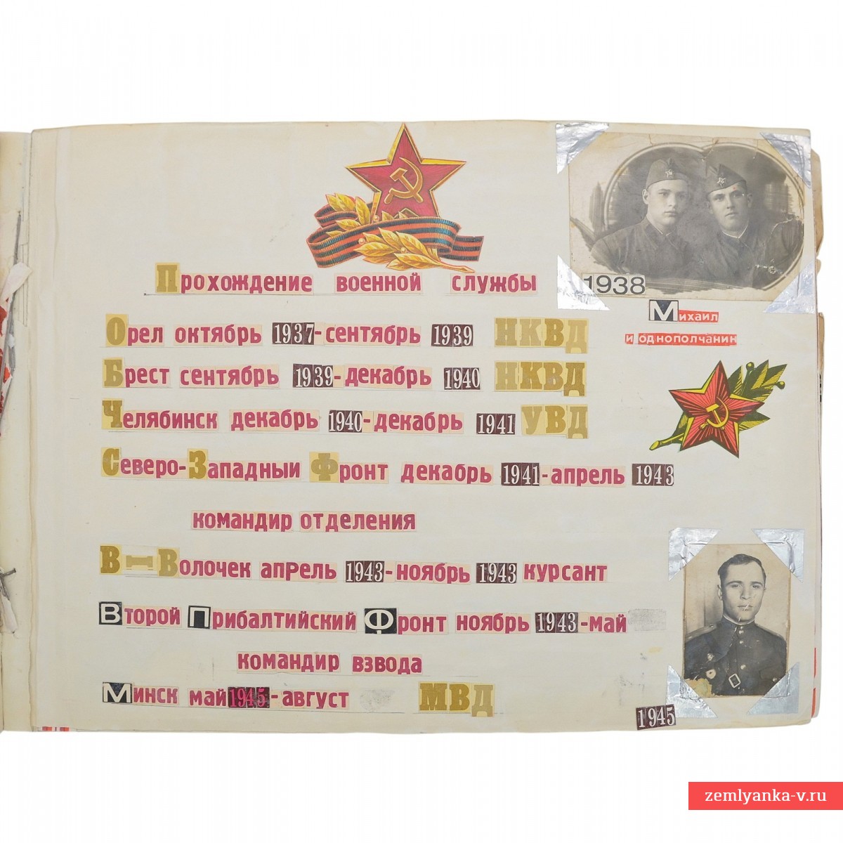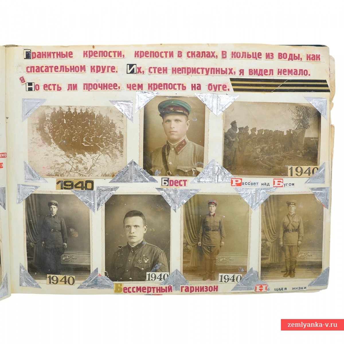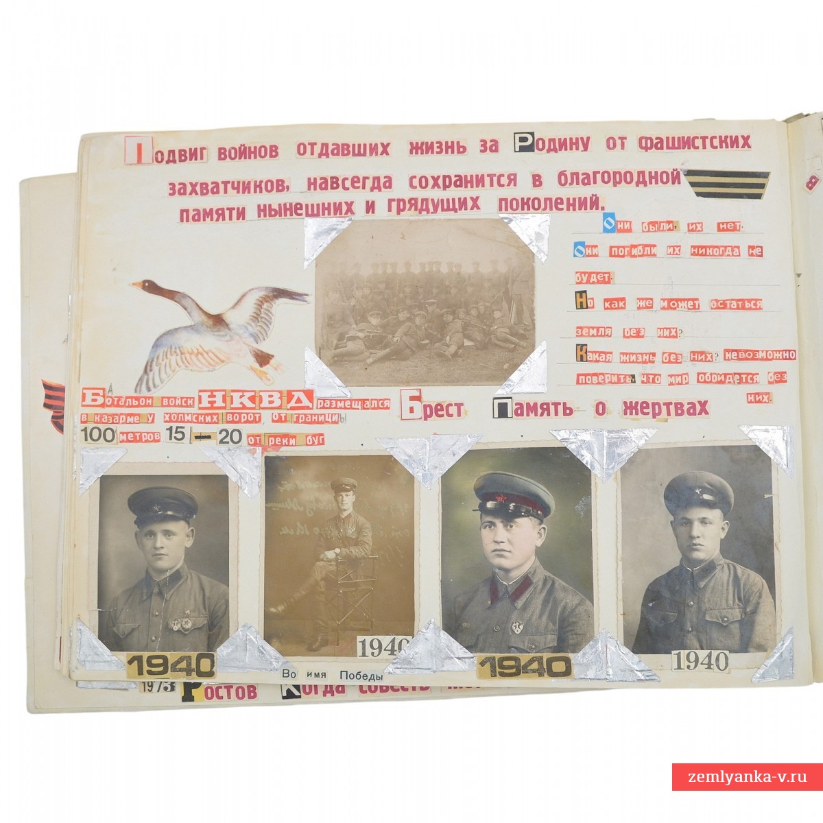 A very interesting and rare photo album, which reflects almost the entire combat and post-war life of a veteran of the NKVD troops, senior Lieutenant Mikhail Buravkov. The album contains a large number of photographs of the officer himself and his colleagues, including the defenders of the Brest Fortress. Hardcover. The page size is 300*400 mm. The album also contains more than 2 dozen original documents of the veteran and greeting cards.