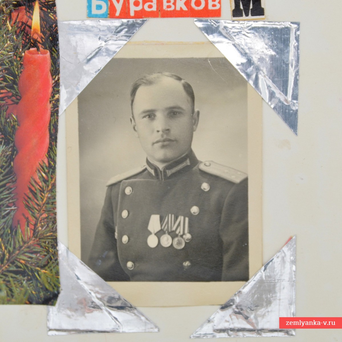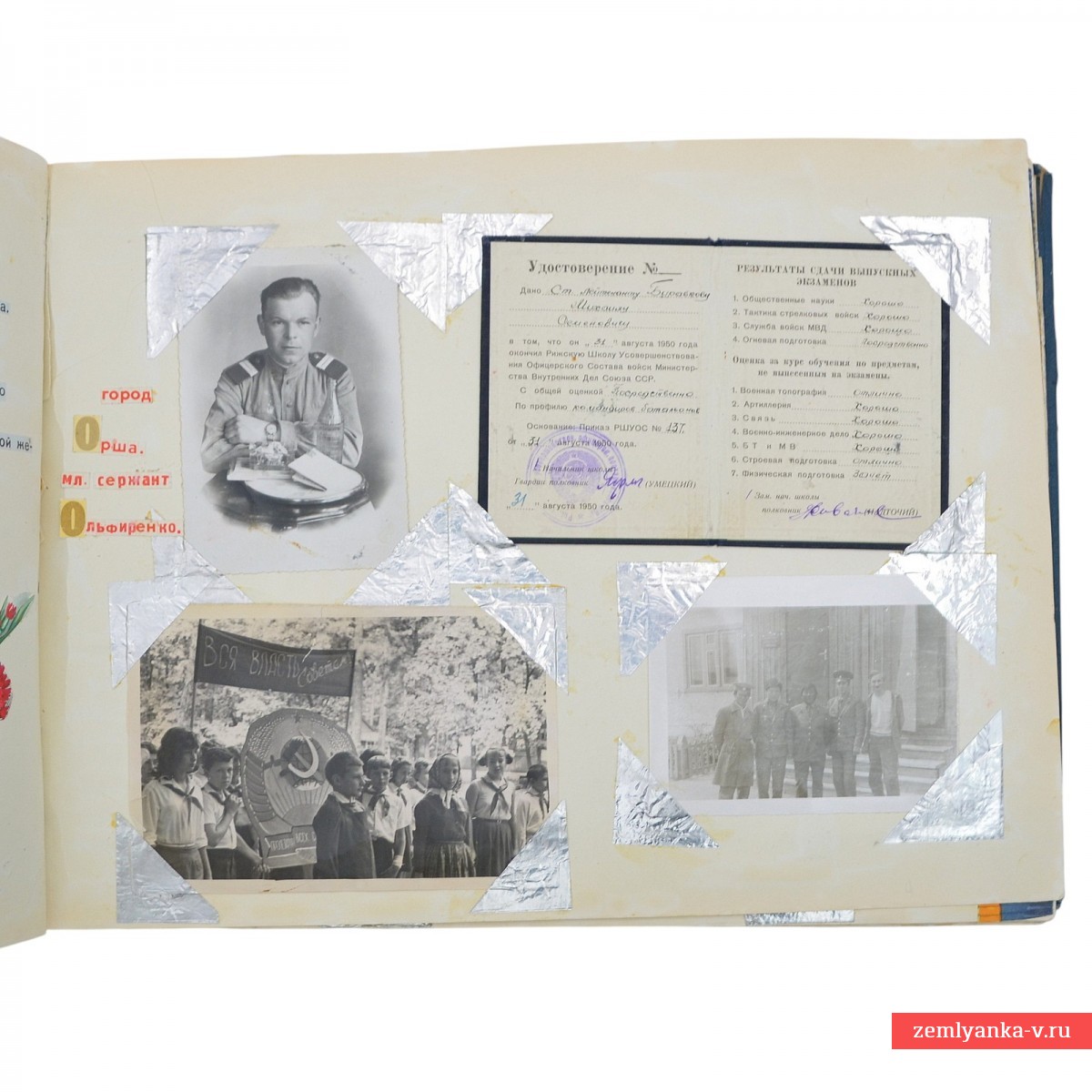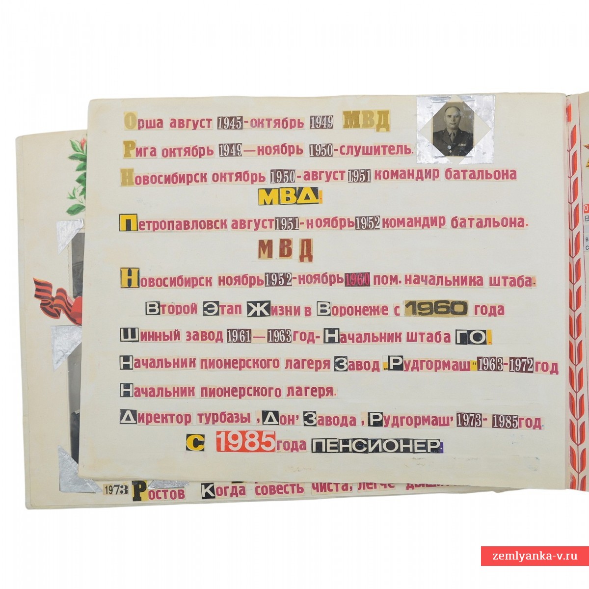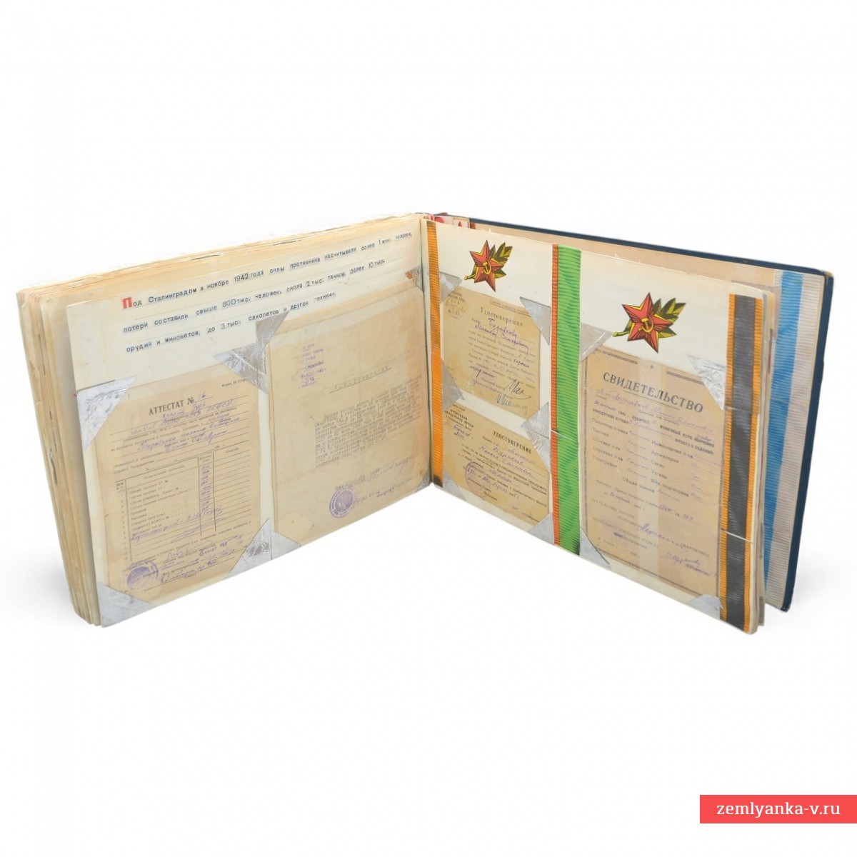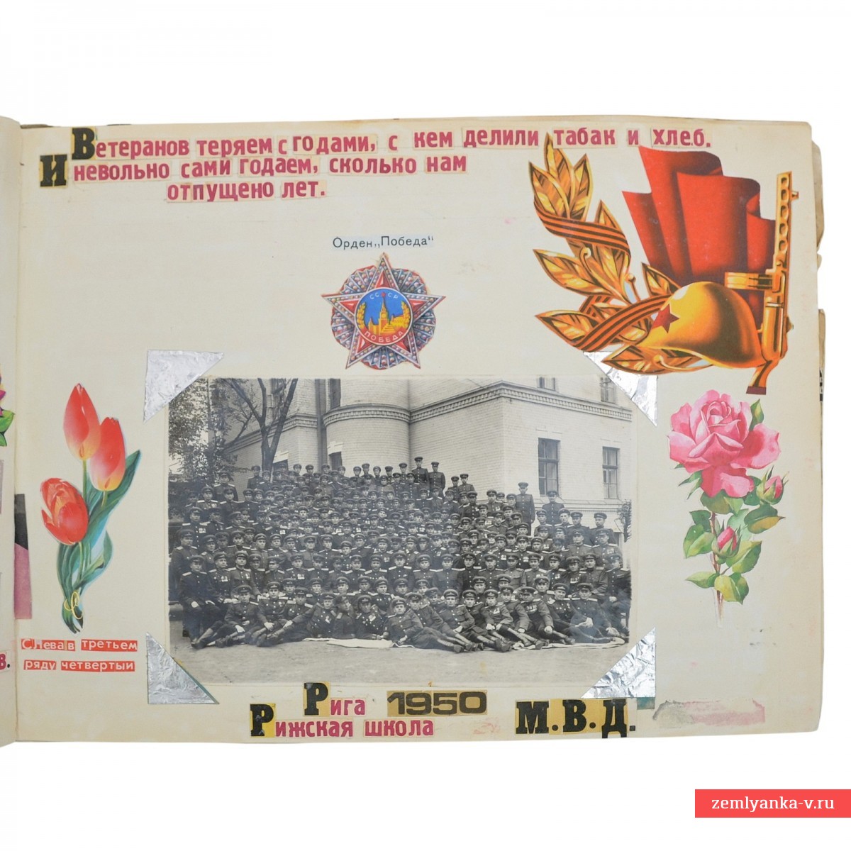 A very interesting and rare photo album, which reflects almost the entire combat and post-war life of a veteran of the NKVD troops, senior Lieutenant Mikhail Buravkov. The album contains a large number of photographs of the officer himself and his colleagues, including the defenders of the Brest Fortress. Hardcover. The page size is 300*400 mm. The album also contains more than 2 dozen original documents of the veteran and greeting cards.
