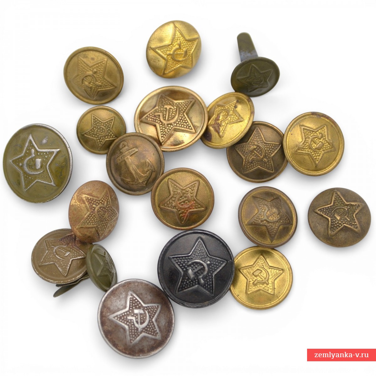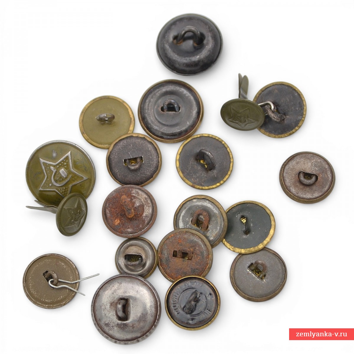 Steel, stamping, bronzing, gilding, paint. The lot includes 19 different buttons of the Red Army and Navy: shoulder straps, gymnastic, cap and cap. Excellent condition of almost all buttons. Guarantee of authenticity.
