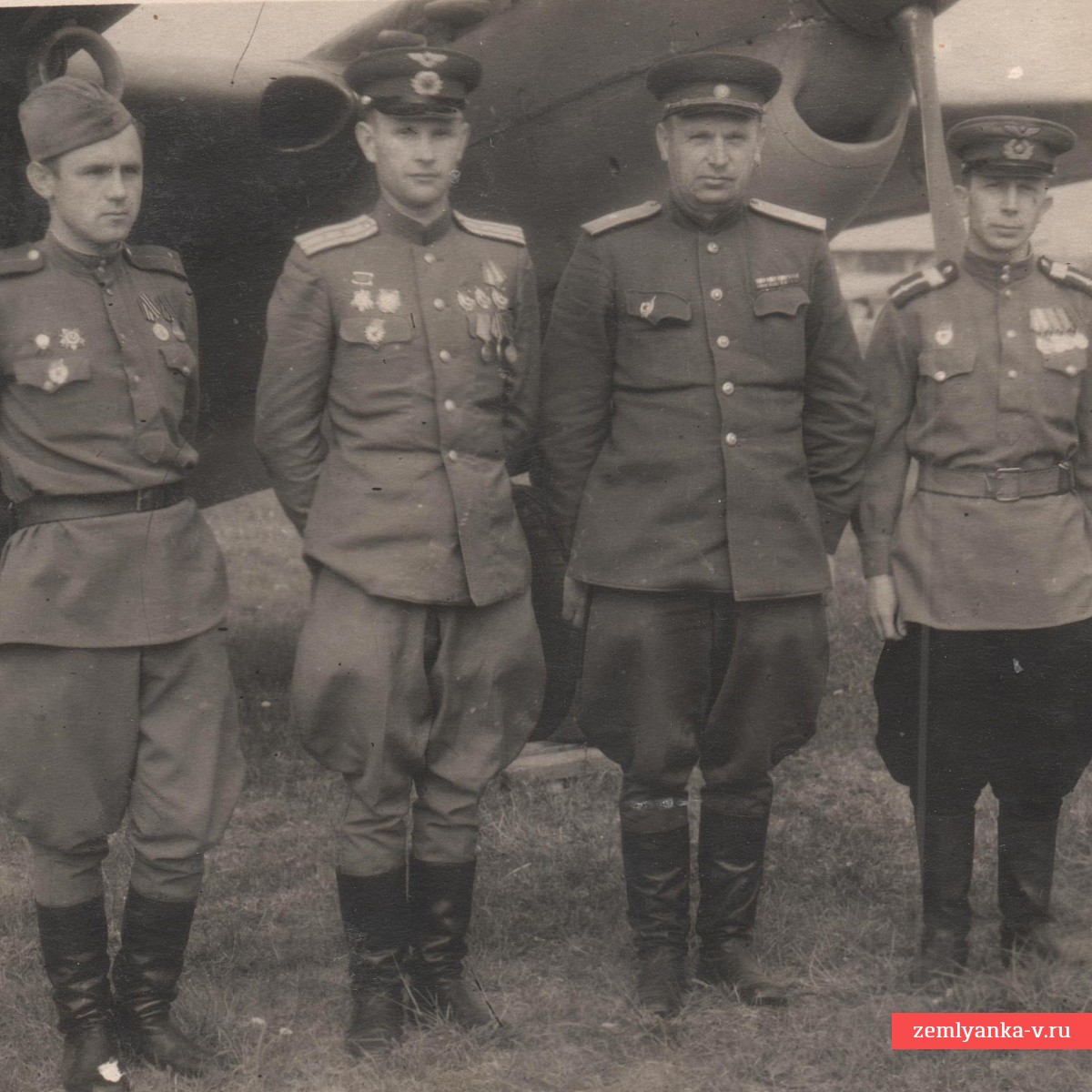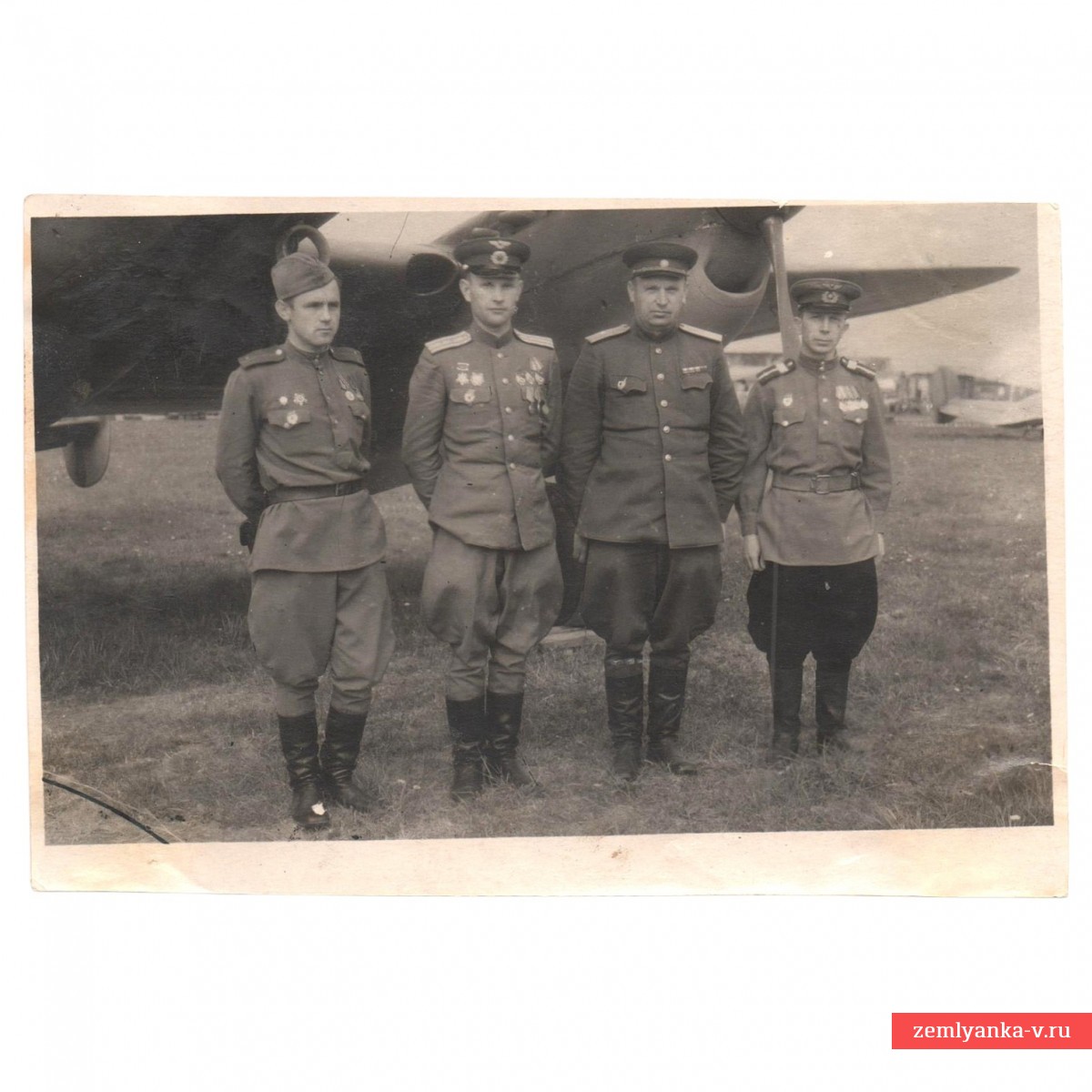 An original and quite rare front-facing shot in very good collector's condition. There are traces of pasting into the album on the back. The size is 110*165mm. From the front-line album of an officer of the regiment. In the photo in the center, Sergey Pavlovich Andreev (7.10.1901, Velikiye Luki — 27.7.1990, Sheremetyevo cemetery, Dolgoprudny) — Major General of Aviation (4.2.44 No. 115), drafted into the Red Army (1922), graduated from: 2nd Borisoglebsk Military School of Pilots (1928), participant in the Soviet-Finnish War (1939-40), commander of the 3rd Guards Bomber Aviation Smolensk Orders of Suvorov and Kutuzov Division (22.1.43-1946); awarded the orders of: Lenin (6.11.47), the Red Banner (21.5.40, 7.7.44 and 3.11.44), Suvorov 2nd (19.4.45) and 3rd art. (5.9.43), the Patriotic War 1st art. (6.4.85), the Red Star (25.5.36); memoirs "Wing to wing" (1962). Major Popov, the regiment's navigator, stands next to him. Guarantee of authenticity.