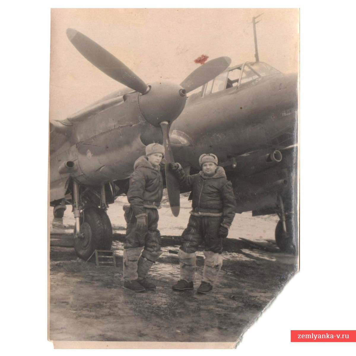 An original and rather rare front-line photograph in good collector's condition. There are traces of pasting into the album on the back. Loss of the bottom corner. The size is 108*147 mm. In the photo on the right, the regimental commander, Lieutenant Colonel V.I. Dymchenko, on the left, the regiment's navigator, Major Popov. Read more about the regiment commander here http://allaces.ru/p/people.php?id=29 From the front-line album of an officer of the regiment. Guarantee of authenticity.