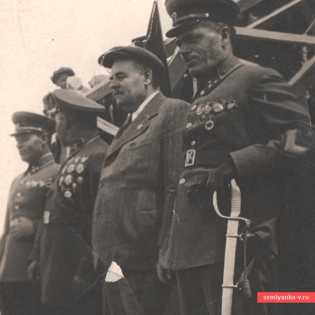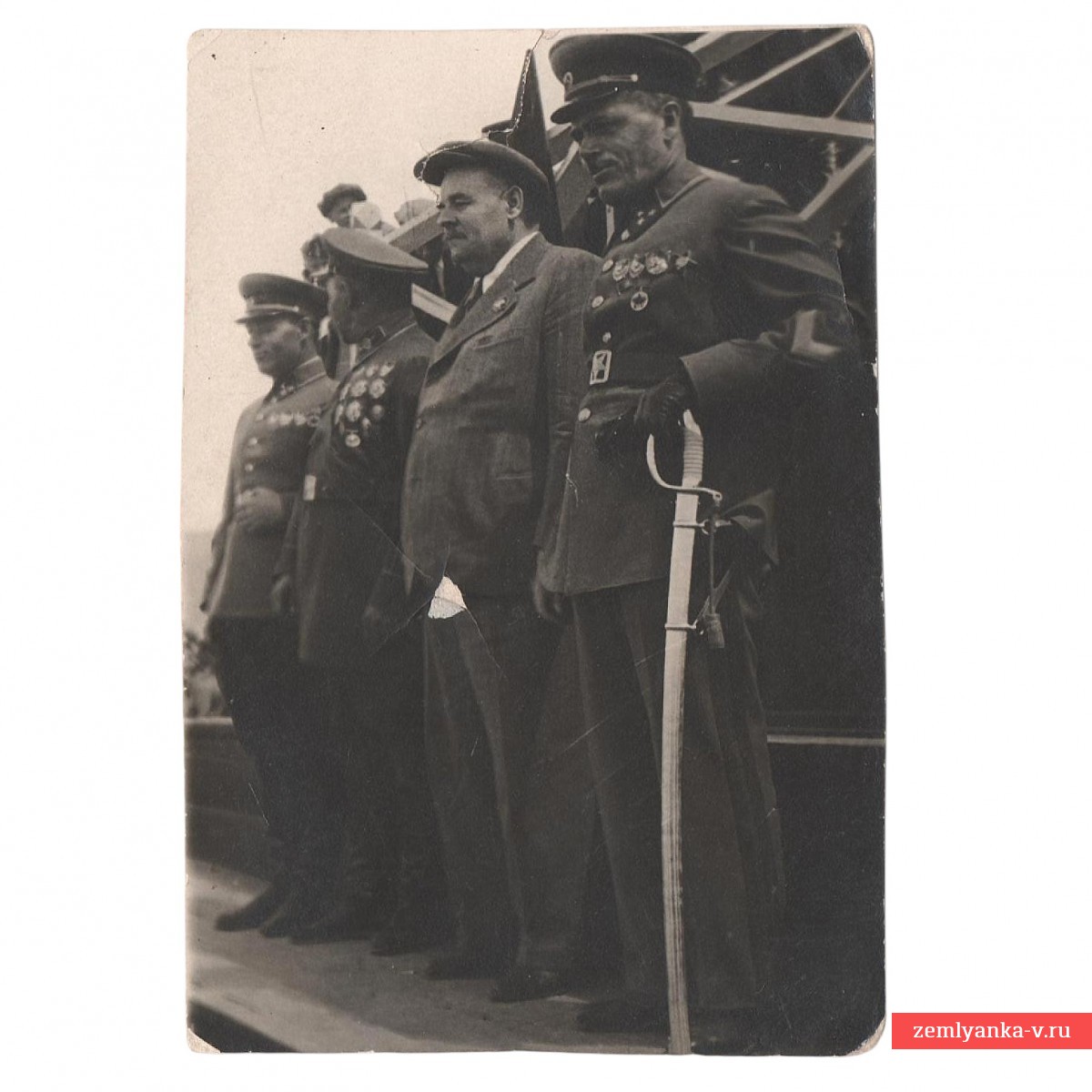 An extremely rare photograph taken in 1943 during the visit of the Soviet delegation to Mongolia. The photo size is 6*9 cm. From right to left are: Colonel-General M.P.Kovalev, Commander of the Trans—Baikal Front, Chairman of the Presidium of the Supreme Soviet of the RSFSR A.E. Badaev, Marshal of the MNR Choibalsan. Of particular interest is the saber in Kovalev's hands: the fact is that its design was approved only on 15.01.1943 by order of the People's Commissar of Defense of the USSR No. 25 "On the introduction of new insignia and changes in the uniform of the Red Army." The order introduced the order of wearing shoulder straps and a new cut of uniforms for all Red Army personnel, different from the cut of 1940, including for generals. It states: "When in full dress uniform, infantry and cavalry generals were supposed to have a saber. The guard and scabbard of the saber are nickel-plated, the handle is white bone, the clasp is gold on a red ribbon with white edges." The description corresponds to the appearance of the generals' ceremonial sabers on Victory Day Parade in 1945 If there is a description of the weapon sample, it means that the sample itself has already been developed. This saber was not adopted by the Red Army as a combat weapon, but was only defined by the order of the clothing service as belonging to the dress uniform. The use of this saber to supply the Red Army generals lowered the status of the saber, which was adopted by the Red Army in December 1940, leaving only the words "combatant commanding staff" in its designation. When developing a model of cold steel for the new generals' uniforms, the infantry officer's saber of the 1913 model was used as a basis. This saber was very similar in design to the 1940 model saber already adopted by the Red Army, but its truly brilliant appearance was more in line with the general's status. Considering that the visit took place in March 1943, the Soviet military leaders did not have time to sew a full-dress uniform with shoulder straps, as a result of which they used the old pre-war one. At the same time, Kovalev is already wearing a saber, introduced two months earlier. Apparently, this is the earliest known example of wearing a general's saber mod. 1943. Guarantee of authenticity.