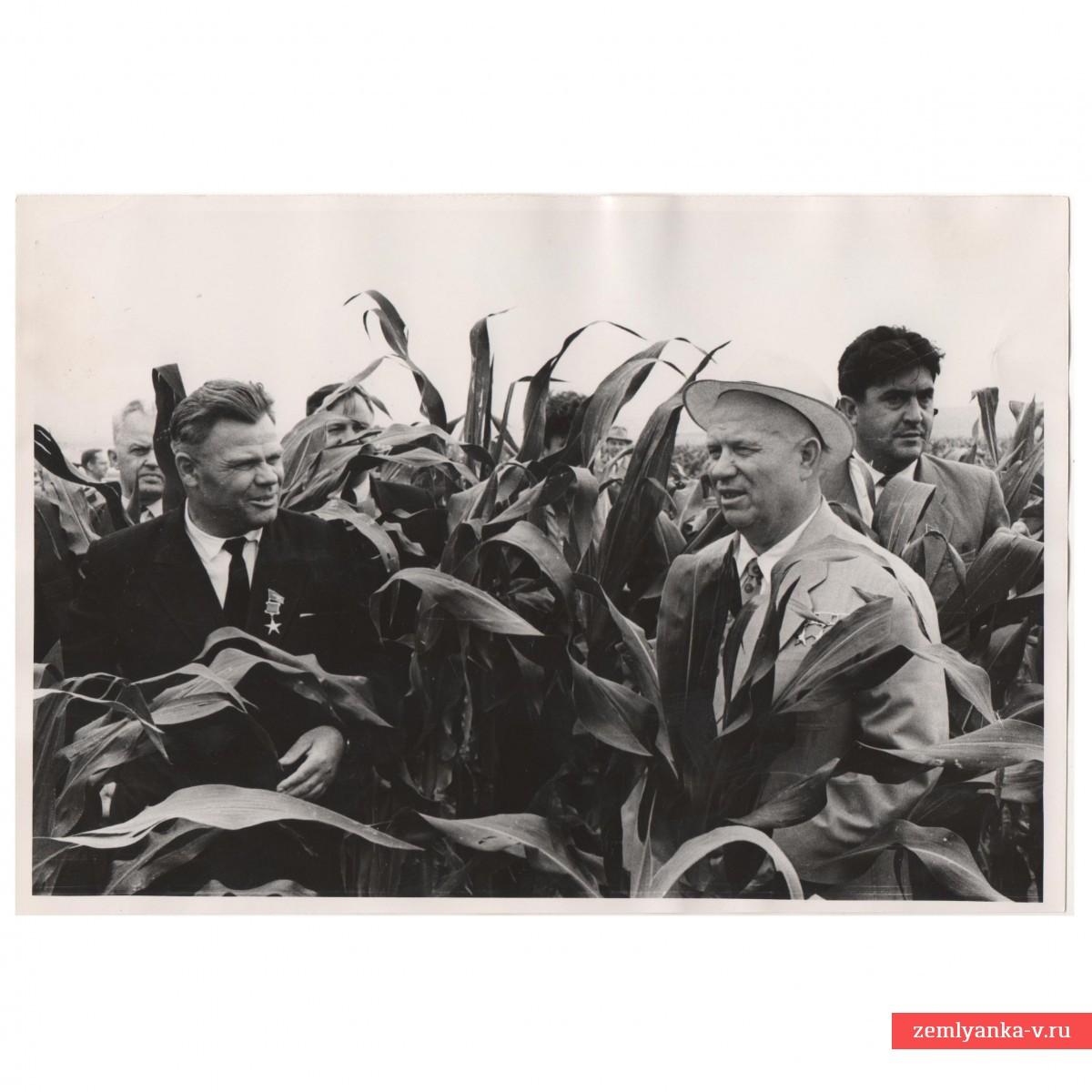 The original press photo is in excellent condition. The full title is "V.V. Grachev, Chairman of the collective farm of the village of Kalinovka, Kursk region, shows Nikita Sergeevich Khrushchev corn in the collective farm field." The size is 16.5*24 cm. The label and stamp of the APN agency are on the back. Guarantee of authenticity.