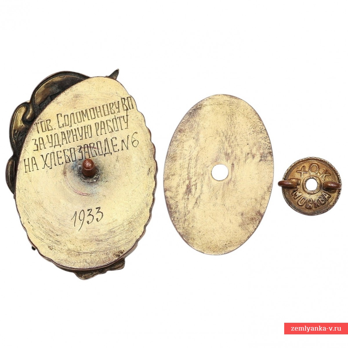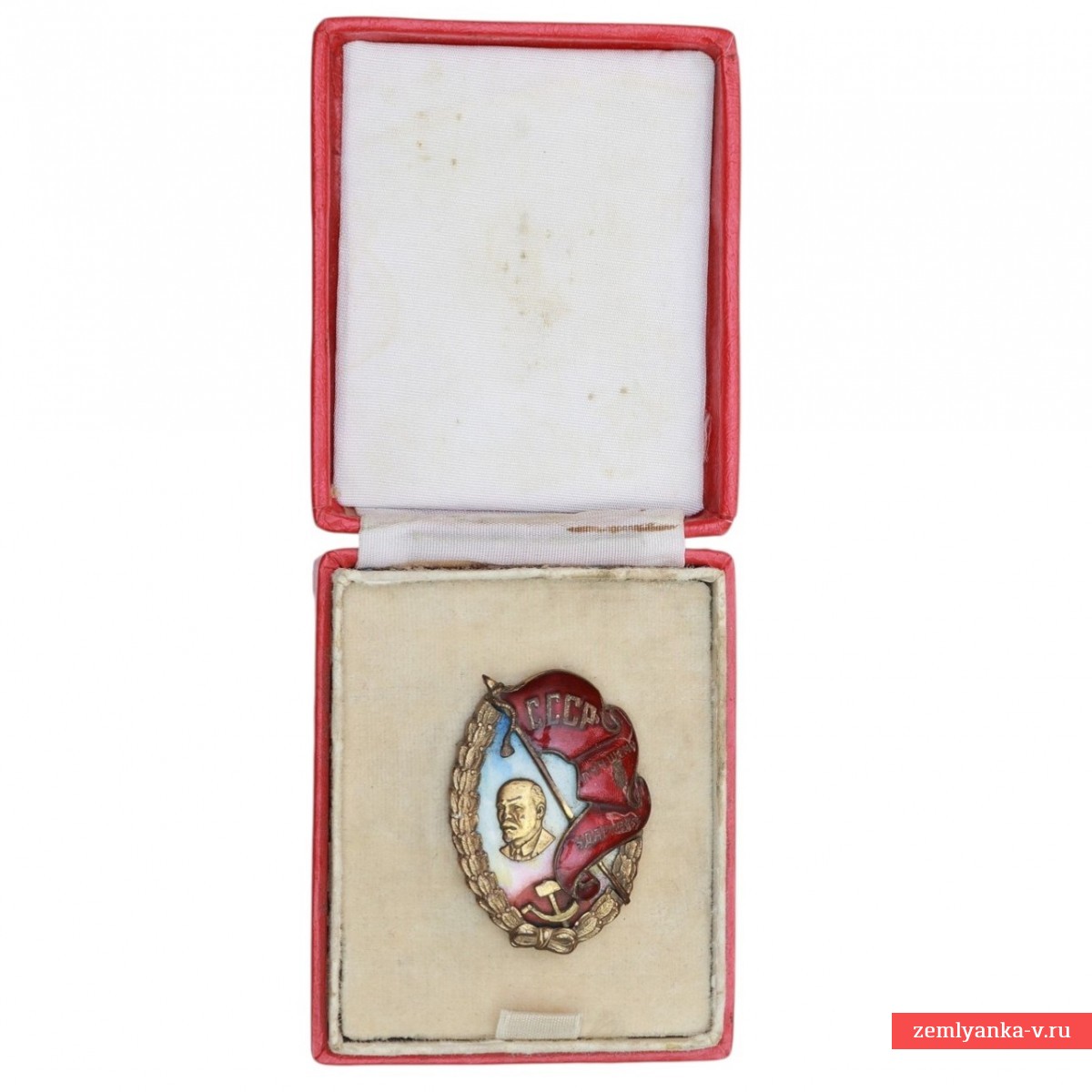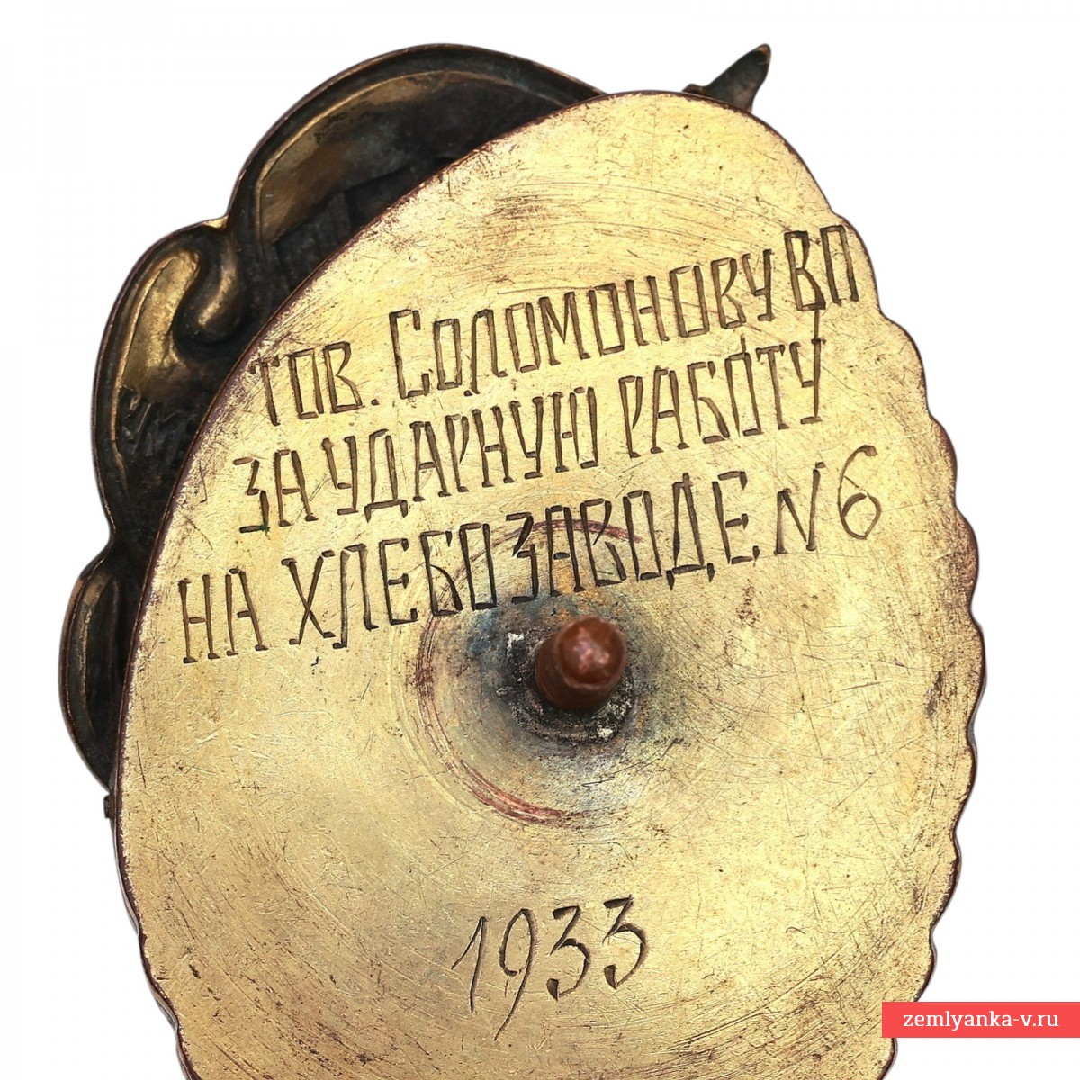 An original and very rare badge in good collector's condition. Awarded to the best drummer of bakery No. 6, V. P. Solomonov, Bronze, gilding, enamel. The sign is an oval with a wreath of ears of corn. In the center there is a bas-relief of V. I. Lenin against the background of a blue-white sky. On the right is a red banner with the inscription "USSR TO THE BEST DRUMMER." In the lower part there is a crossed sickle and a hammer. The size is 58*43 mm. In the original case. This badge of honor was awarded for outstanding labor achievements during the period of industrialization and mass socialist competition in the USSR. Guarantee of authenticity.