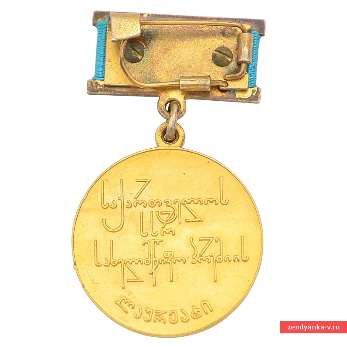 The original badge is in excellent collector's condition. This award was awarded for outstanding achievements in various fields, including science, technology, literature and art in The Georgian Soviet Socialist Republic. It has been awarded since 1965. The medal is round in shape, made of 585 (?) gold. Weight with pad is 21.4 grams. The diameter is 24 mm. The obverse (obverse side) depicts a stylized hammer and sickle framed by the sun's rays and a wreath of laurel branches in the lower part. It is suspended from a rectangular shoe covered with a blue (turquoise) ribbon. The edition is 50 copies. Extremely rare. Guarantee of authenticity.