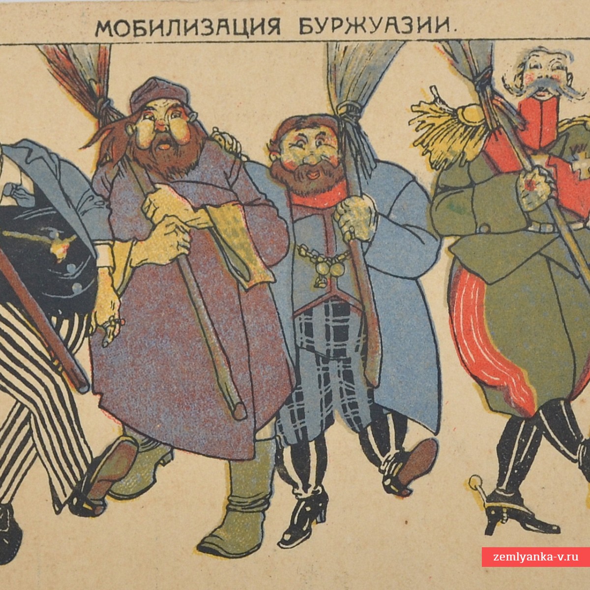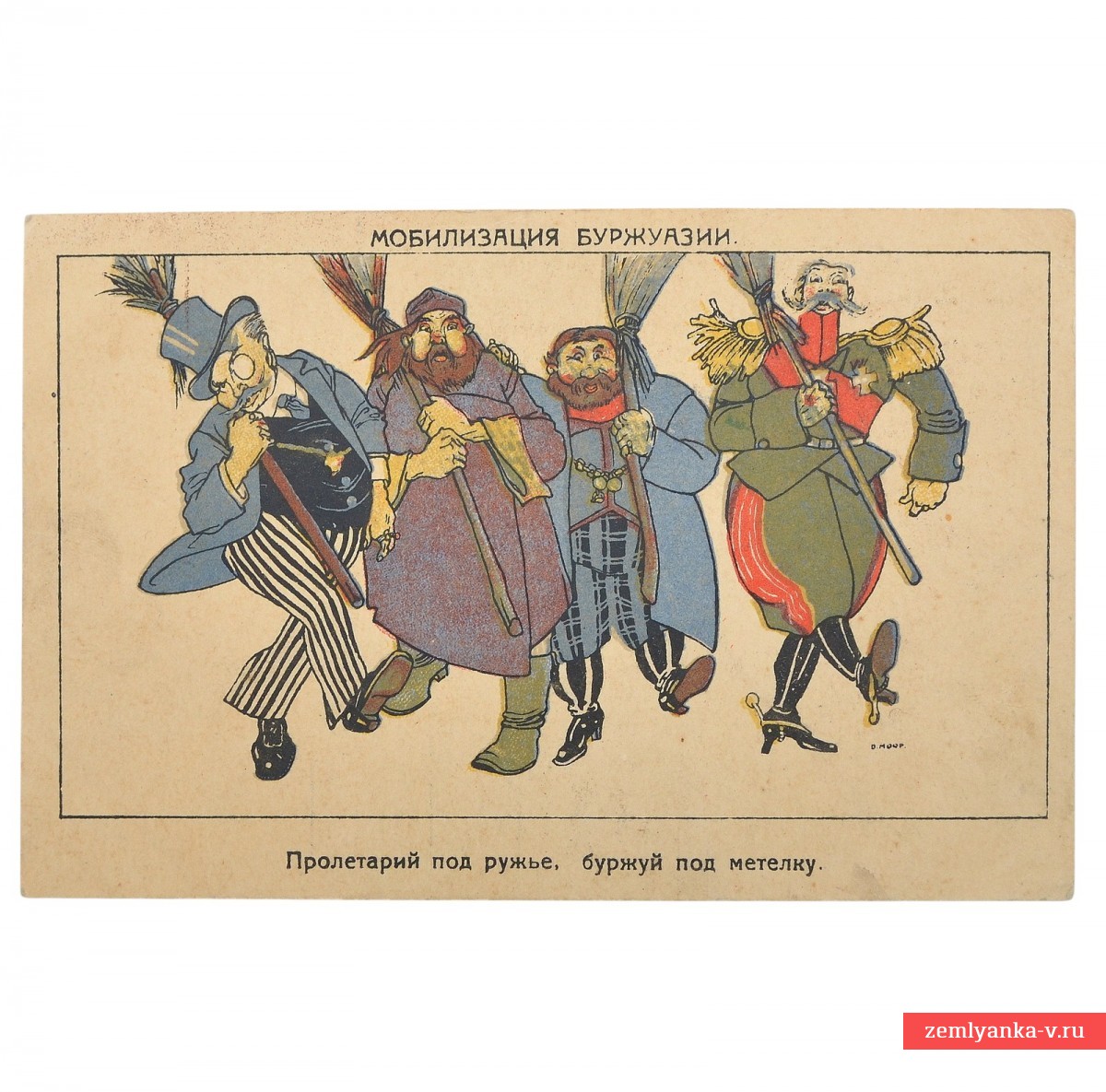 The postcard entitled "Mobilization of the bourgeoisie" with the slogan "Proletarian under the gun, bourgeois under the broom" is a well-known example of Soviet propaganda during the Civil War in Of Russia.