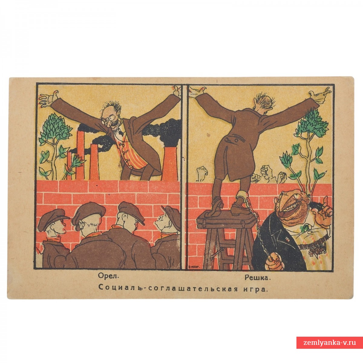 The postcard is satirical in nature and is intended to ridicule the so-called "social compromisers" (Mensheviks, Socialist Revolutionaries and other moderate socialists) who tried to reconcile the interests of the bourgeoisie and the proletariat. The image consists of two parts, like two sides of a coin ("Heads" and "Tails"), demonstrating the duplicity of the policy of compromise.: