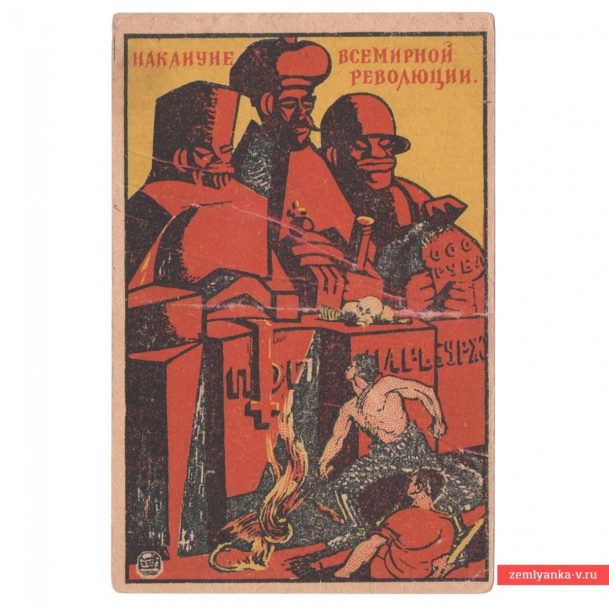 The poster on which the postcard was printed was created by a Soviet graphic artist. Dmitry Moore (the pseudonym of Dmitry Stahievich Orlov) in 1920, at the height of the Civil War in Of Russia. The poster depicts three monumental figures symbolizing the old regime – a priest, a tsar and a capitalist (a bourgeois with a bag of rubles with the inscription "RSFSR") – standing on a pedestal. Below, naked men with torches set fire to the base of the pedestal, embodying the energy and dynamism of the proletariat, preparing to overthrow the old order. The poster called for an international proletarian revolution and supported the idea that a world revolution was near. It was published in an edition of 65,000 copies, which was one of the largest print runs of Soviet posters of the time. The print run of the postcard is unknown. I went through the mail. The bend in the center. Guarantee of authenticity.