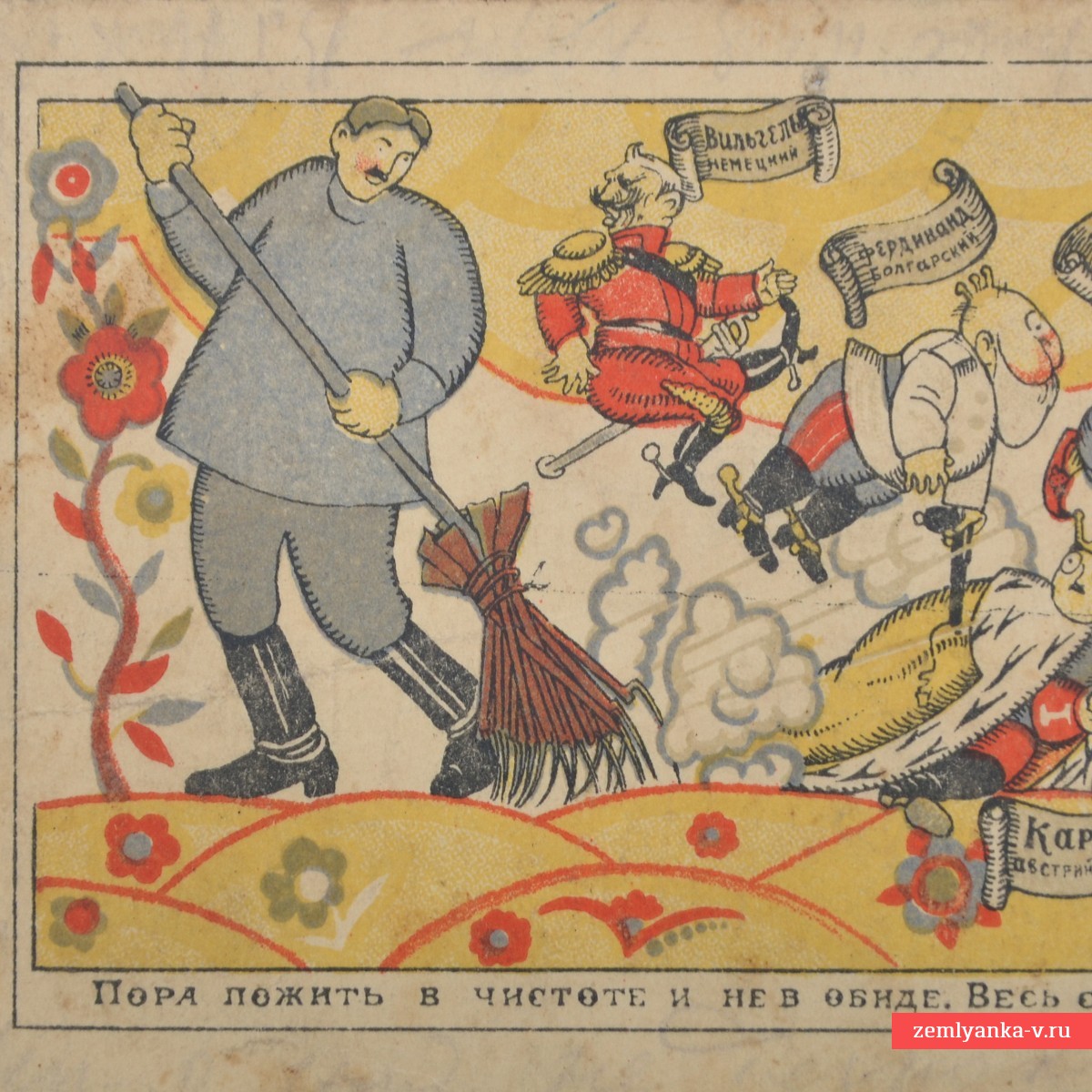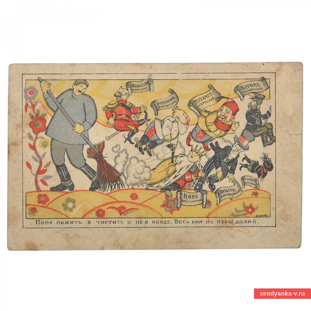 The postcard is made in the style of a Russian splint and satirically depicts the political situation of that time.: