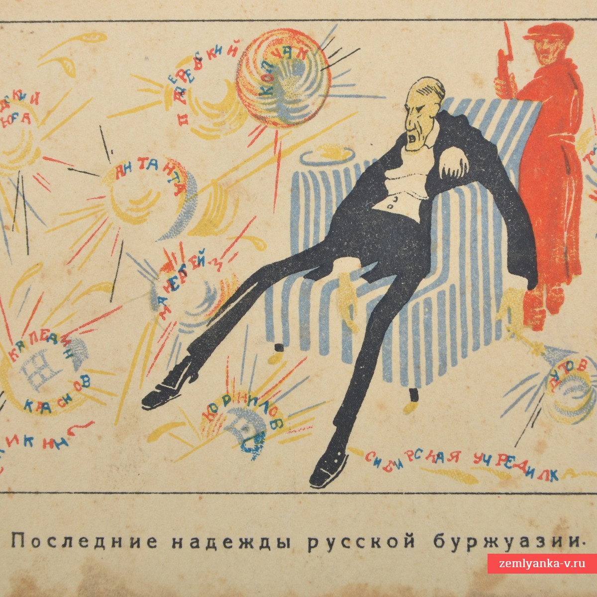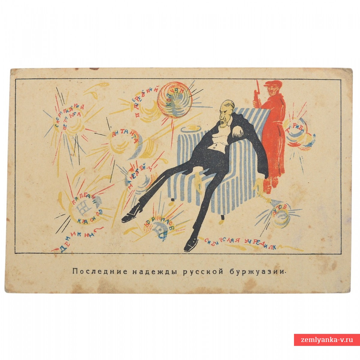 The postcard entitled "The Last Hopes of the Russian Bourgeoisie" is a well-known example of Soviet propaganda during the Civil War in Of Russia.