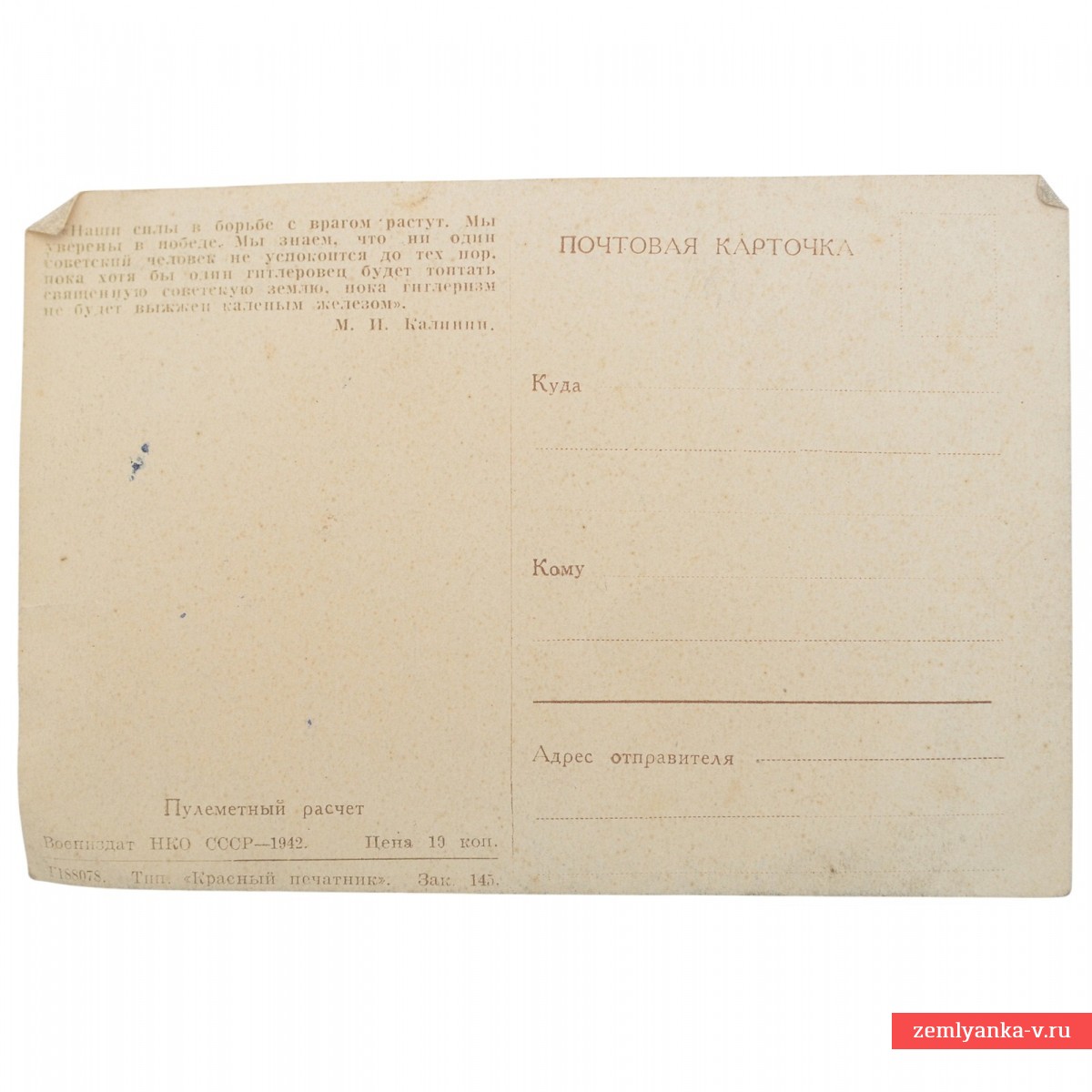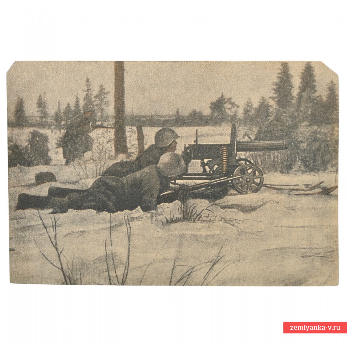 The original WWII postcard is in good condition. This postcard was issued by the Military in 1942. The postcard shows two soldiers lying in the snow and operating a heavy machine gun. Maxim of the 1910 model, which was widely used by the Russian and Soviet armies during the First and Second World Wars. The Second World Wars. It's not filled out, and I haven't received my mail. Guarantee of authenticity.