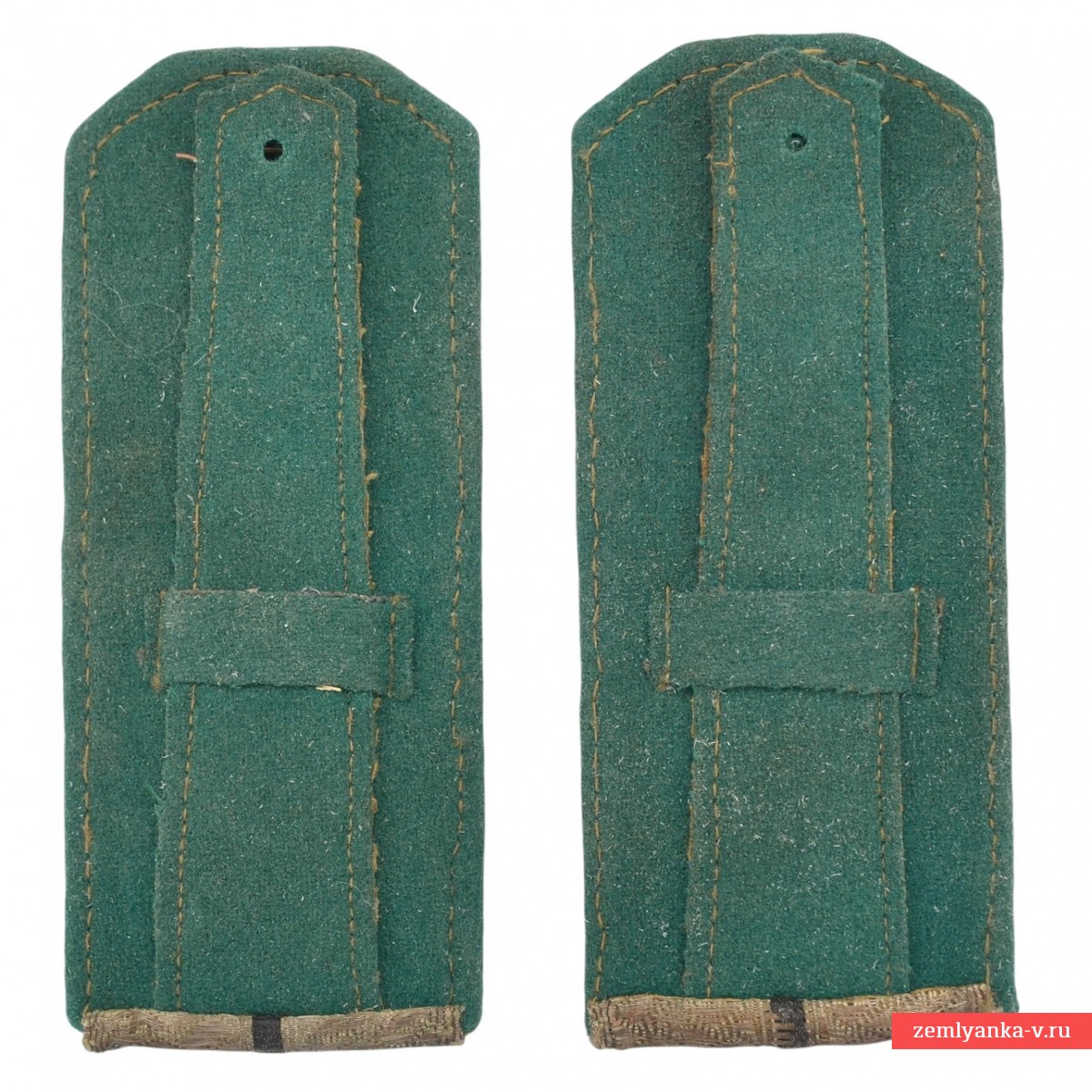 Shoulder straps similar to the military ones, but not identical to those, were installed as insignia for railway workers. The shoulder straps of the higher, senior and middle commanding officers were an elongated hexagon with parallel long sides. The lower end of the shoulder strap was cut off at a right angle, and the upper end ended in a cut-off obtuse angle with the side of the cut parallel to the lower edge. The edges of the shoulder strap, except for the lower one, were edged with light green cloth. The length of the shoulder strap, depending on the size of the clothes, ranged from 13.5 to 15.5 cm. The width of the shoulder strap with edging was 6 cm for the senior commanding staff, 5.5 cm for the senior and middle officers. The edge width was 0.25 centimeters, and the height of the bevel of the cut obtuse corner of the top was 1 centimeter. The shoulder straps had a frame, a strap and a belt loop served to fasten the shoulder straps to the clothes.