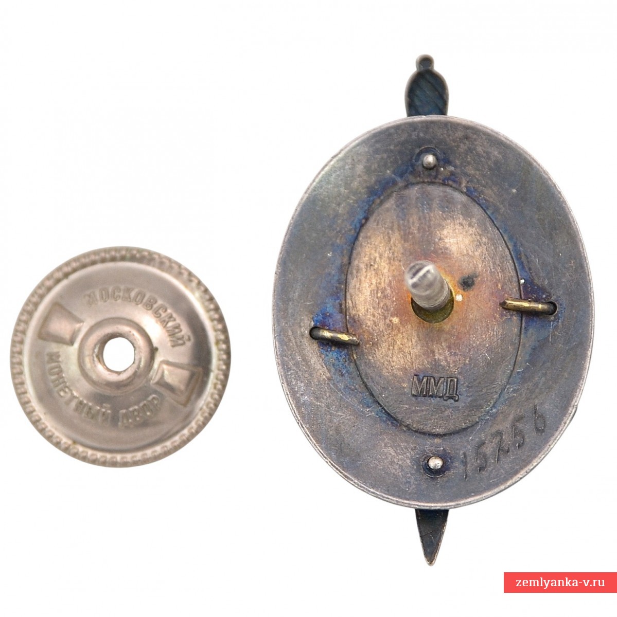 The original sign is in excellent condition. Bronze, enamel, silver plating. The badge is an oval shield of red enamel with a silver-colored sword with a gold hilt superimposed on it. A gilded hammer and sickle are superimposed on the sword in the center of the sign. In the lower part of the sign, along the golden rim of the shield, there is a red enamel ribbon with the inscription "Interior Ministry" in the central part. On the reverse side is the award number 15256. Guarantee of authenticity. Rare.