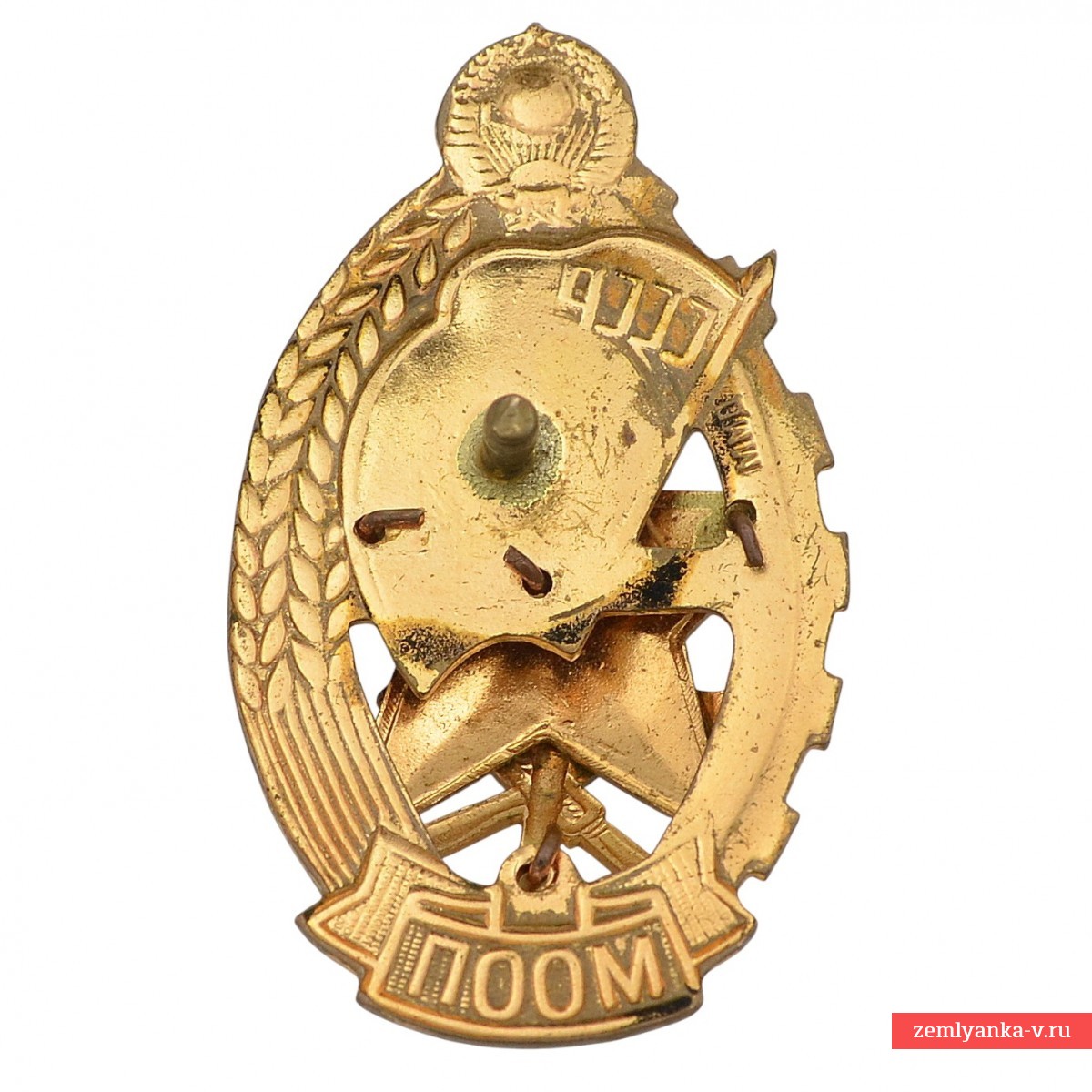 The badge "To the best fire protection officer" was established by the resolution of the Commission of the Presidium of the Central Executive Committee of the USSR (No. ST-84) dated January 8, 1936. The badge had three modifications – with the abbreviations "NKVD", "MOOP" and "MVD". The badge was awarded to the middle and senior staff of fire protection units for their active work in strengthening the fire protection of the USSR, exemplary and selfless work on fires. The badge is worn on the right side of the chest, located after the signs "Honored Worker of the Ministry of Internal Affairs", "For excellent service in the Ministry of Internal Affairs". It was made of bronze in the shape of an oval, measuring 50x30 mm. In the central part there was a relief five-pointed star on a red flag with the abbreviation "USSR". On top of the star was a symbol – a monkey wrench and an axe placed crosswise, vertically crossed by a torch. In the upper part there is a coat of arms with seven ribbons (according to the number of republics). A toothed gear peeked out from under the star and banner on the left, and grain ears were located on the right. The pinion and the ears converged at the top under the coat of arms. In the lower part there was a twisted red ribbon with the inscription "NKVD".