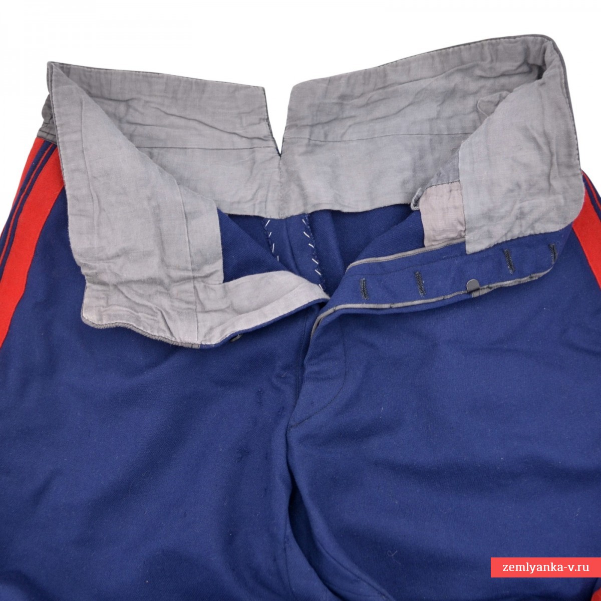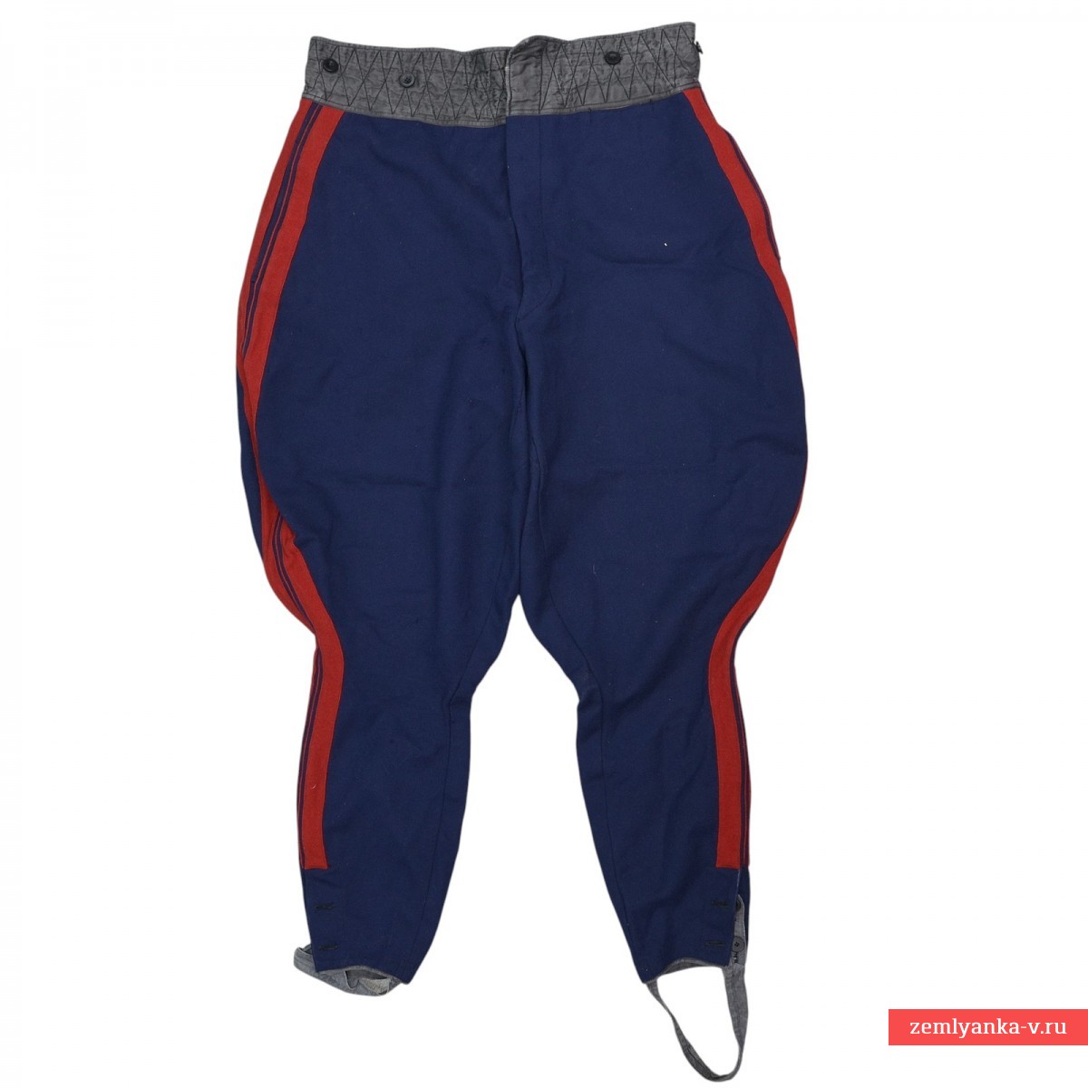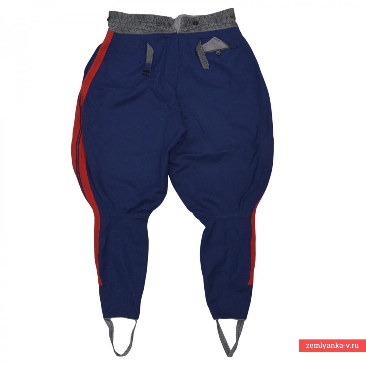 The original and quite rare breeches are in good condition. Introduced by Order of the People's Commissar of Defense of the USSR No. 212 dated July 13, 1940. Trousers-breeches for socks in boots are made of blue cloth. There is an edging and two gaps of red cloth along the side seams. The trousers are made loose at the top and form-fitting legs below the knee. They consist of two front and two back halves, have two side slash pockets, one watch pocket, one back pocket, two belt holsters and straps at the bottom. The trousers are fastened with five buttons and one hook. The size is average. Guarantee of authenticity.
