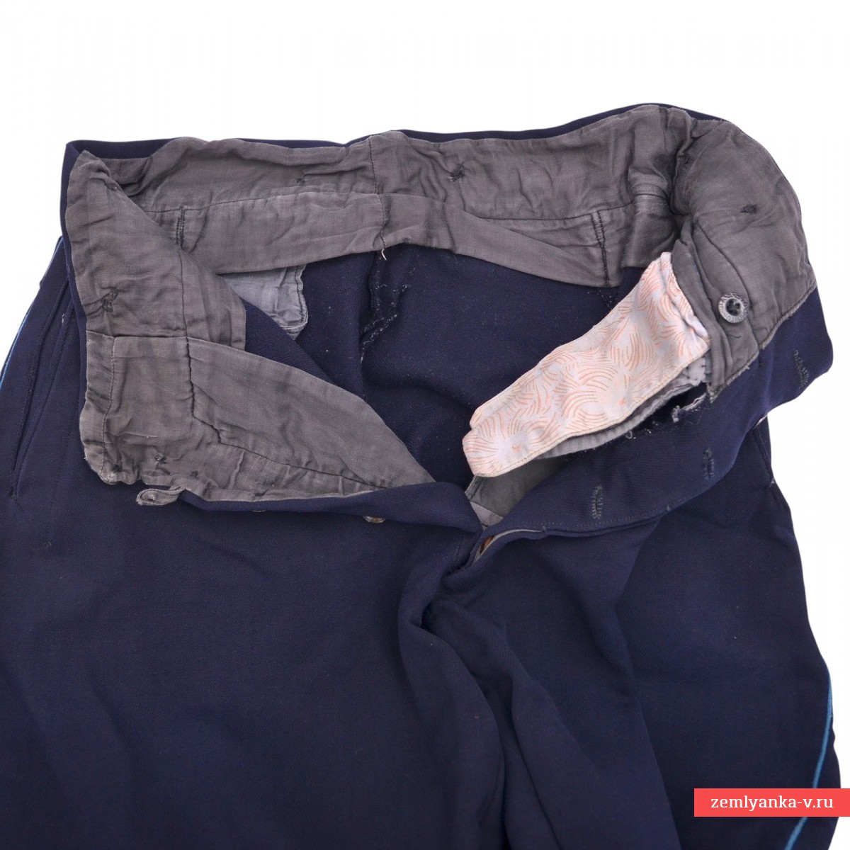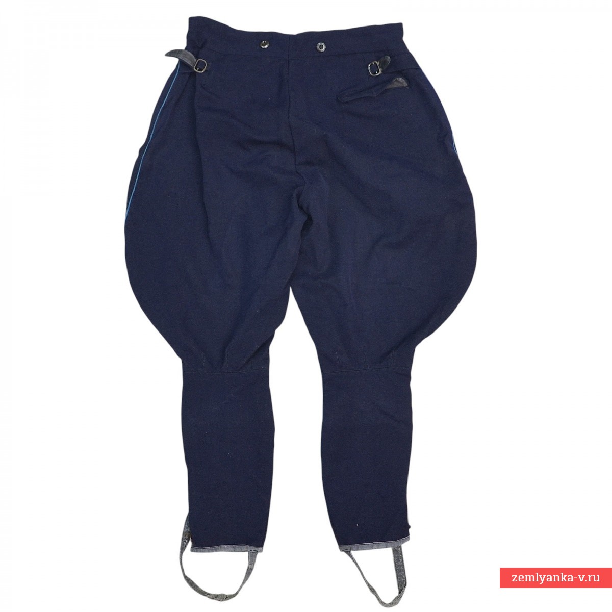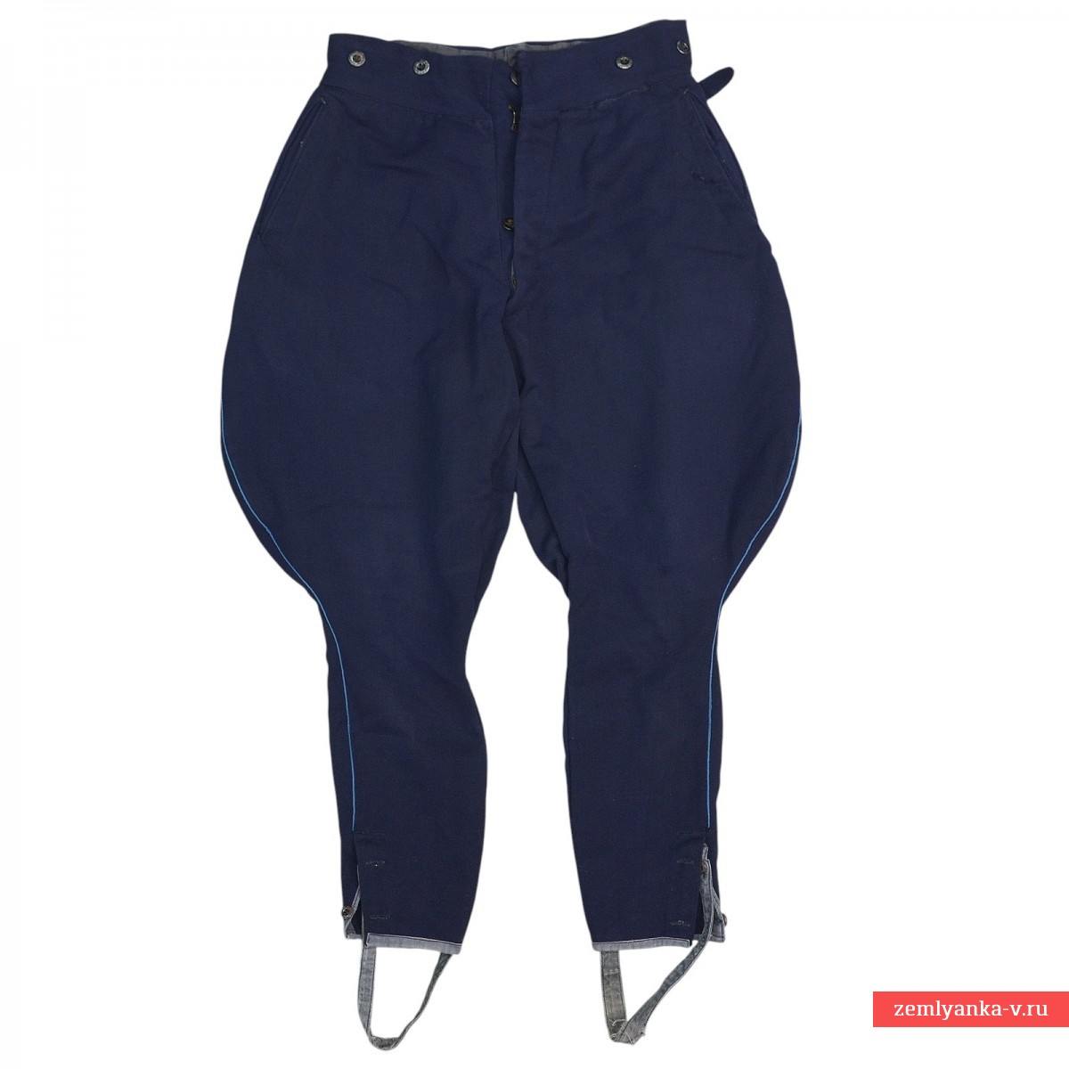 The original and quite rare breeches are in good condition. They are made of diagonal woolen fabric in dark blue with blue edging on the sides. They consist of two front and two back halves, have two side slash pockets, one watch pocket, one back pocket, two belt holsters and straps at the bottom. The trousers are fastened with five buttons and one hook. The size is average. Introduced by Order of the People's Commissar of Defense of the USSR No. 176 dated December 3, 1935. Cancelled by order of the People's Commissar of Defense of the USSR No. 005 dated February 1, 1941: "The transition to new types of uniforms should begin on October 1, 1941 and be fully completed by the end of 1942. The issue of newly introduced items of uniforms should be carried out after the expiration of the period for wearing items of the old uniform." They were re-introduced by Order of the People's Commissar of Defense of the USSR No. 25 dated January 15, 1943. Guarantee of authenticity.