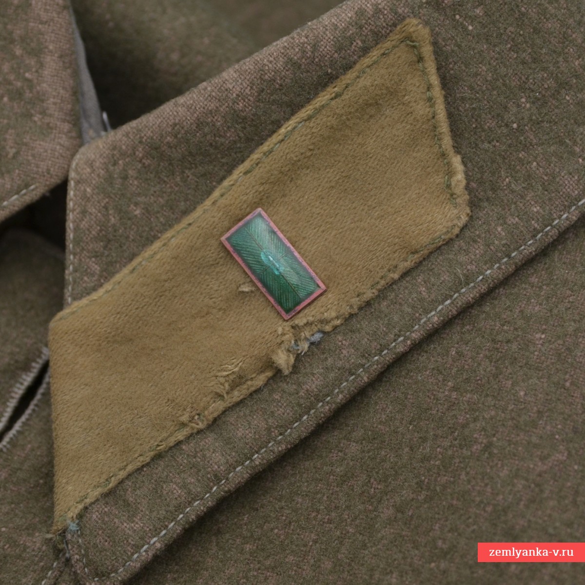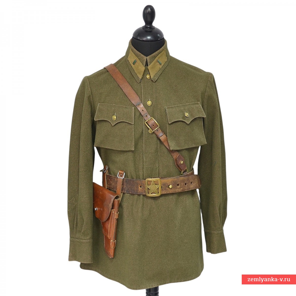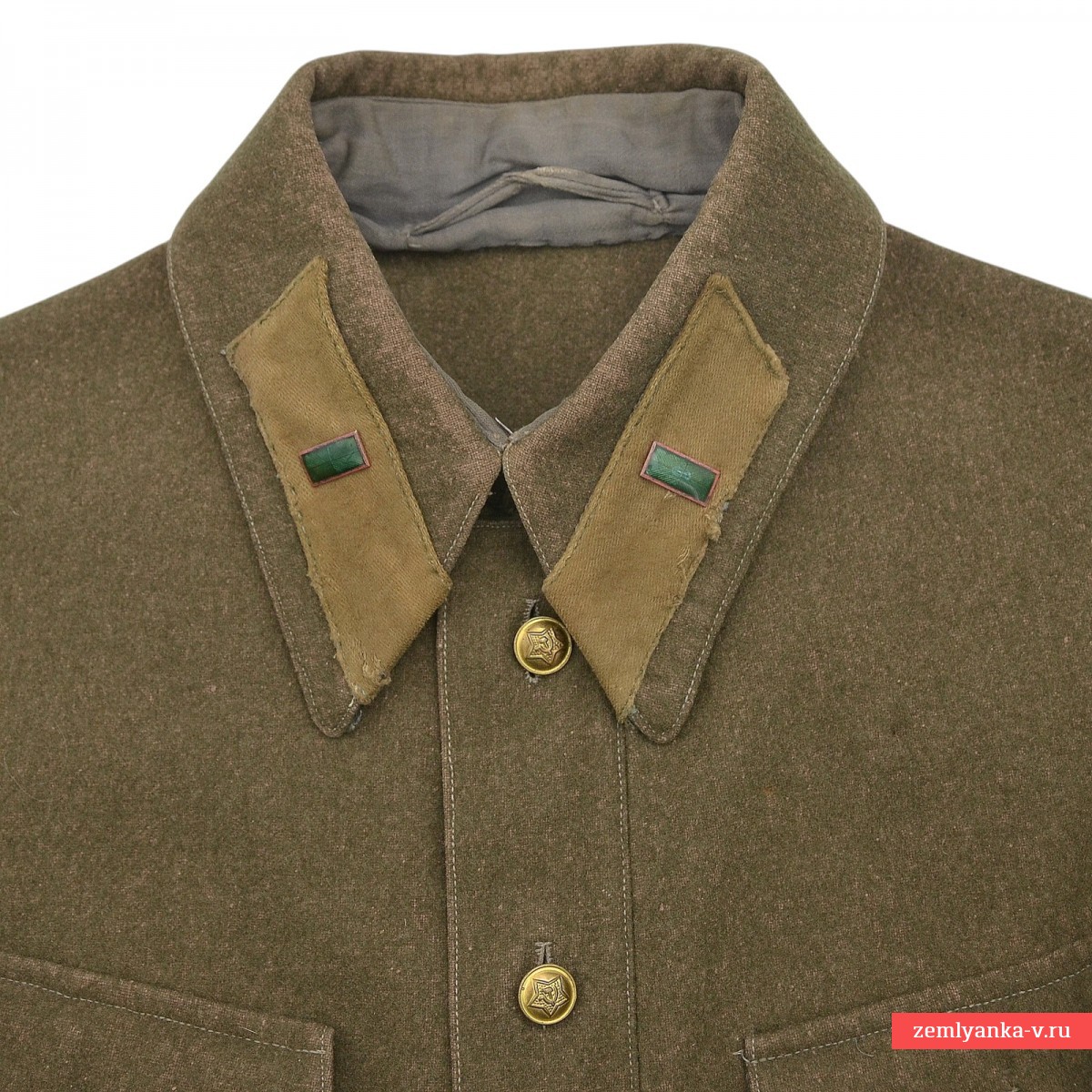 A rare commissariat tunic in very good collector's condition. It is made of khaki cloth with a turn-down collar, fastened with one hook. Original buttonholes of protective color are sewn on the ends of the collar. Captain's sleepers with very beautiful emerald enamel, non-magnetic. The tunic has a chest strap with a three-button closure and two chest pockets with flaps on one button. The sleeves have cuffs with two buttons. The buttons of the tunic are metal of the established pattern. Minor damage to the lint from moths, scuffs from socks on the collar. The size is about 48. The belt and shoulder strap shown in the photo and the holster are not included. It was introduced by Order of the People's Commissar of Defense of the USSR No. 005 dated February 1, 1941. It was abolished by order of the People's Commissar of Defense of the USSR No. 25 dated January 15, 1943. Guarantee of authenticity.