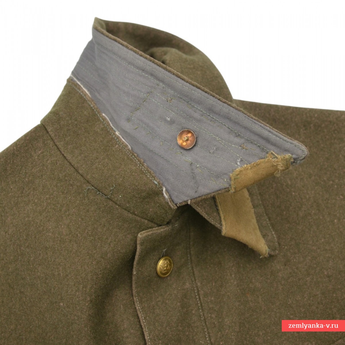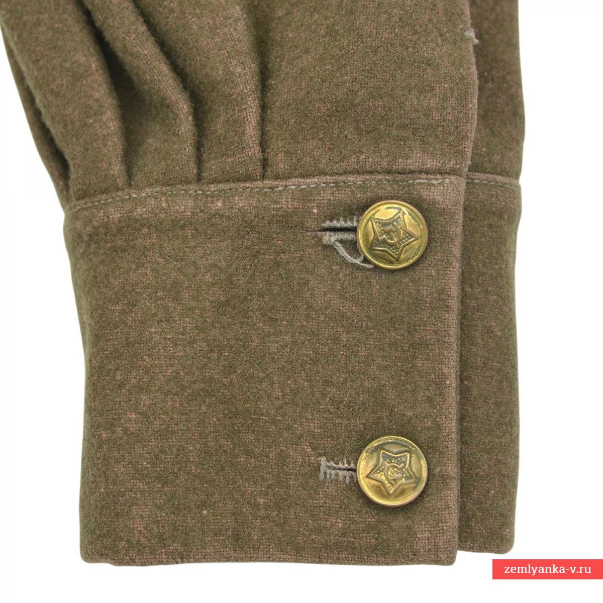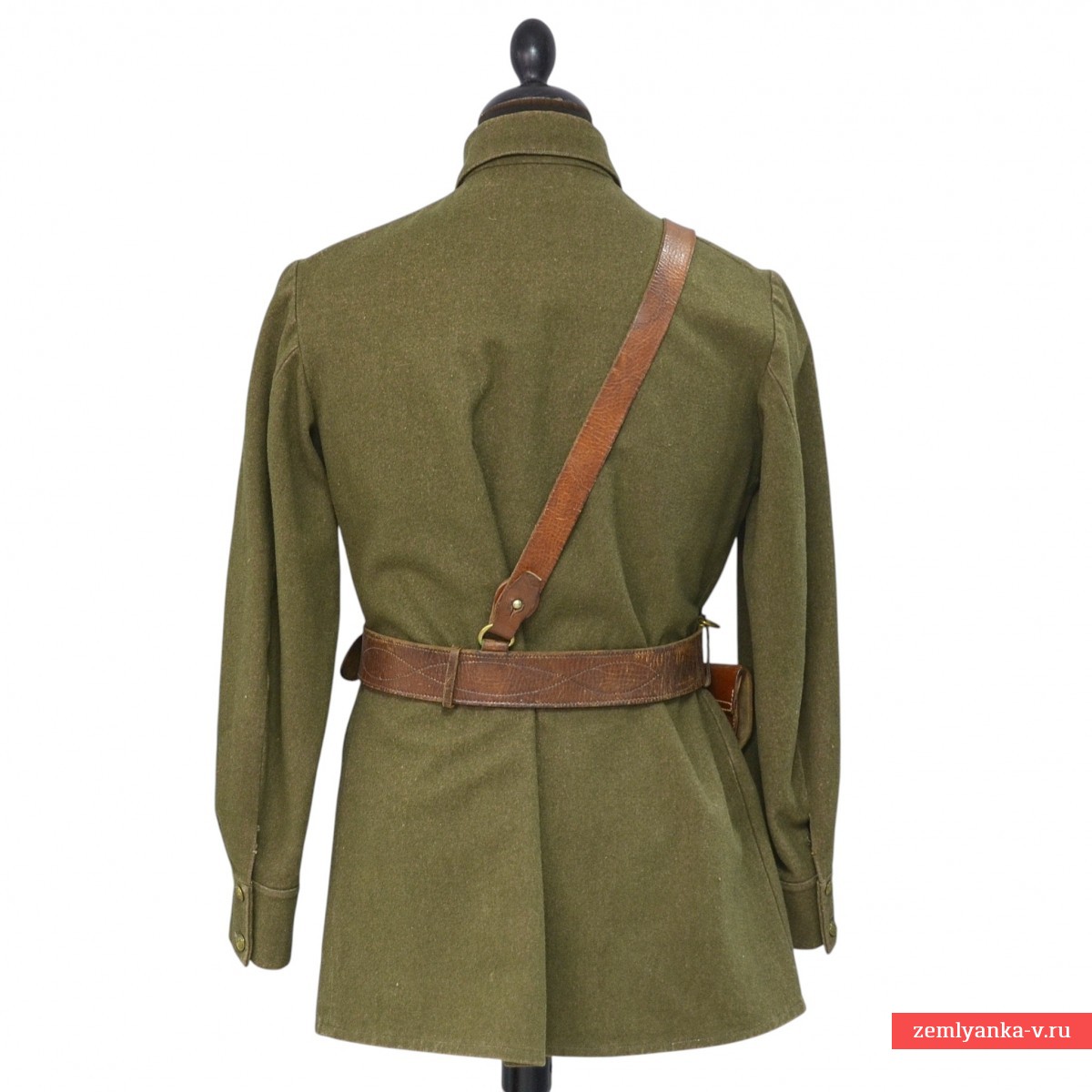 A rare commissariat tunic in very good collector's condition. It is made of khaki cloth with a turn-down collar, fastened with one hook. Original buttonholes of protective color are sewn on the ends of the collar. Captain's sleepers with very beautiful emerald enamel, non-magnetic. The tunic has a chest strap with a three-button closure and two chest pockets with flaps on one button. The sleeves have cuffs with two buttons. The buttons of the tunic are metal of the established pattern. Minor damage to the lint from moths, scuffs from socks on the collar. The size is about 48. The belt and shoulder strap shown in the photo and the holster are not included. It was introduced by Order of the People's Commissar of Defense of the USSR No. 005 dated February 1, 1941. It was abolished by order of the People's Commissar of Defense of the USSR No. 25 dated January 15, 1943. Guarantee of authenticity.