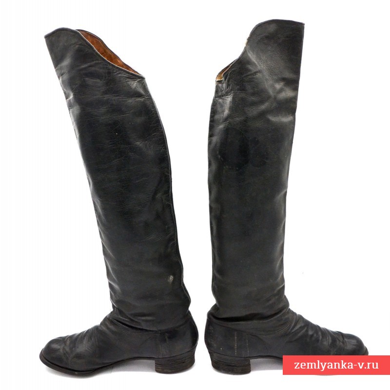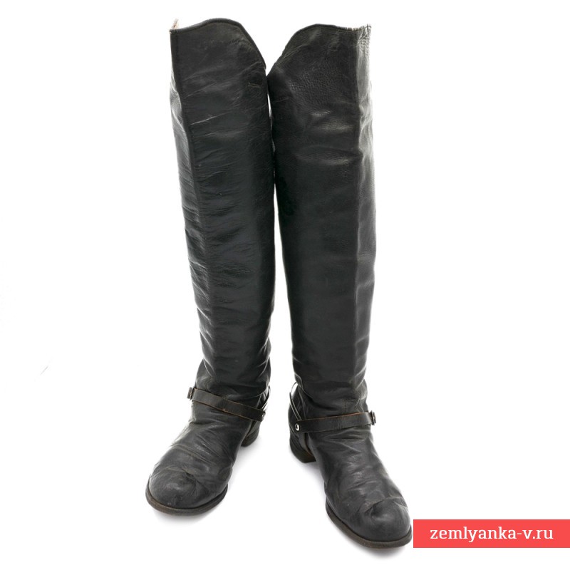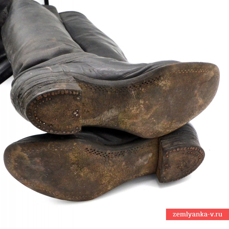 Extremely rare boots in almost excellent condition for their age and degree of rarity. They are identical to pre-revolutionary cavalry boots, with the only difference being that the tops and socks in pre-revolutionary officer shoes were made whole. Leather sole with wooden nails. Size 41-42. There are stamps on the inside of the boot, but they are worn out from wear. Guarantee of authenticity.