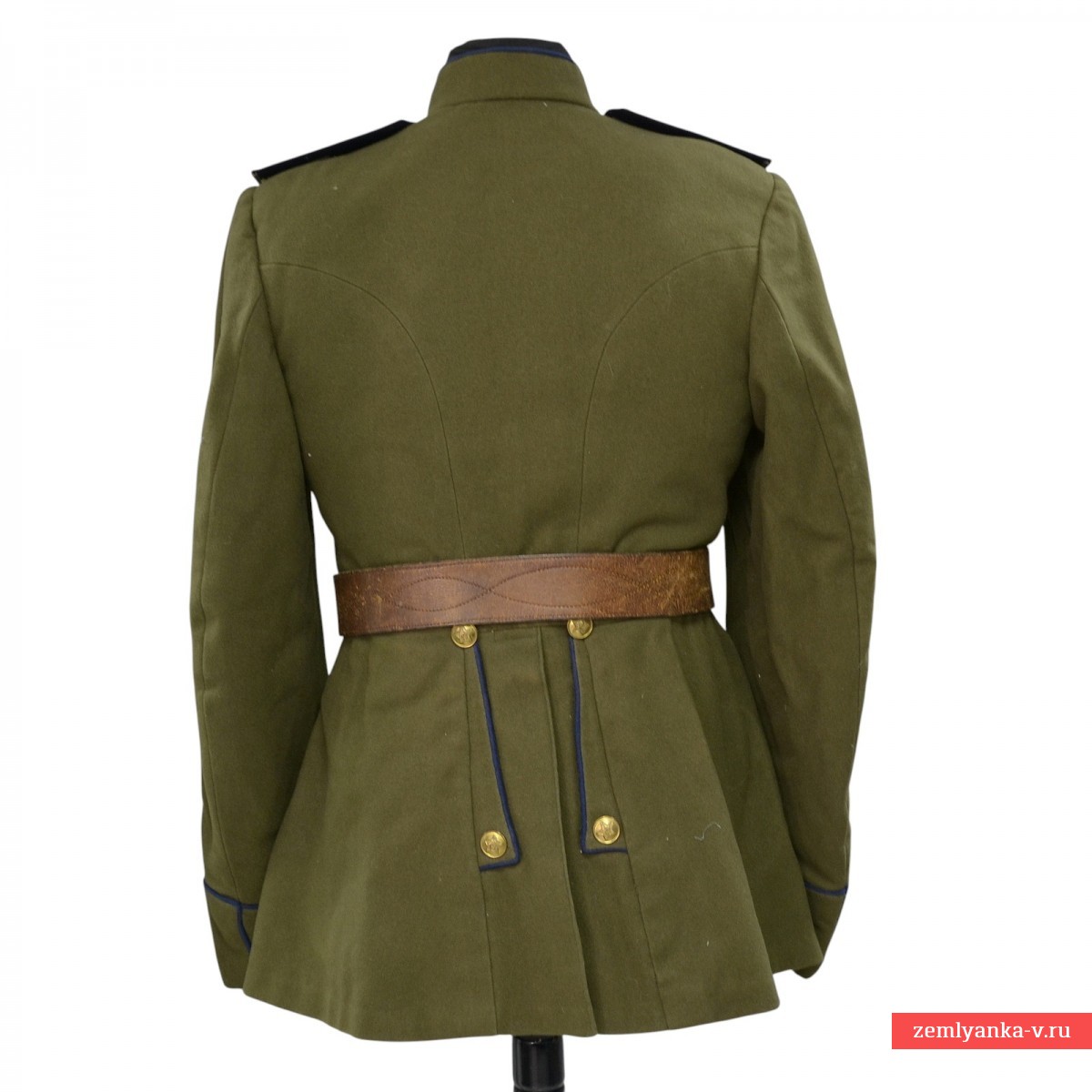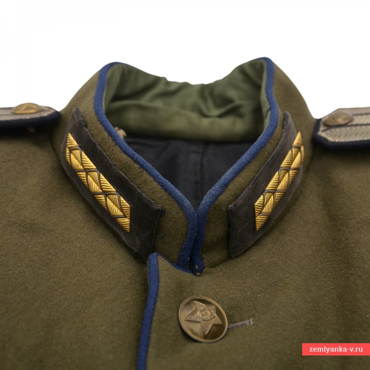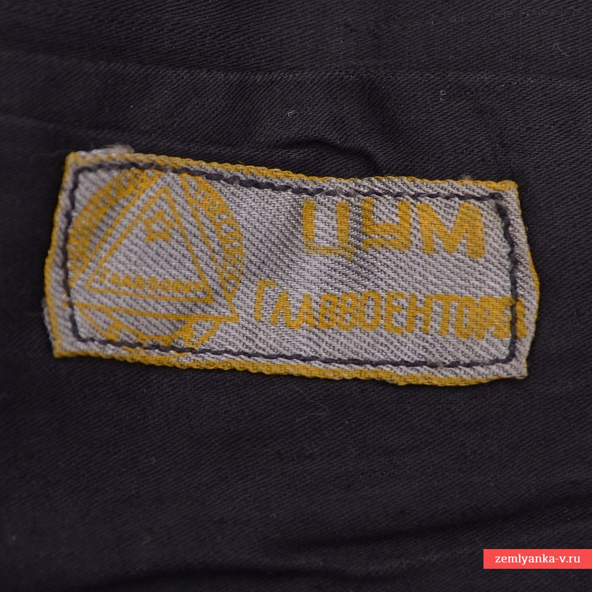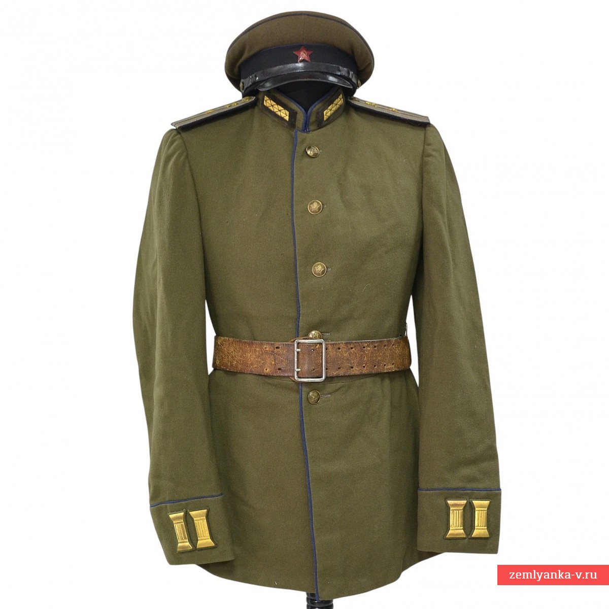 The set includes a dress uniform of the 1943 model and a cap. The uniform is single-breasted, with a cut-off bodice, fastened with five large buttons on the left side. The collar is rigid, stand-up, fastened with two hooks and loops. The upper edge and ends of the collar are trimmed with blue edging. On the collar of the uniform, at an equal distance from its upper and lower edges and 1 cm from the ends, buttonholes (without edging) are sewn from the instrument cloth. The buttonholes have 2 brass gilt strips with black gaps, introduced in 1947. The sleeves of the uniform are double-stitched, with straight side cuffs, edged at the upper edge and ends. There are two brass vertical buttonholes (columns) on the sleeve cuffs, respectively, in accordance with the established shape. There are leaves sewn on the tail of the back, at the ends of which one large button is sewn. Edging along the edge of the left side, collar, leaflet and cuffs, color — according to the type of troops (in our case, blue, corresponding to the engineering troops). All buttons are uniform, brass. The TSUM tag is sewn inside Glavvoentorg. Size 46-48, average height. It was introduced by order of the People's Commissar of Defense of the USSR No. 25 dated January 15, 1943. The uniform is completed with an original cap, sewn at the factory of hats in Moscow. The cap size is 56-57. The belt is not included. Guarantee