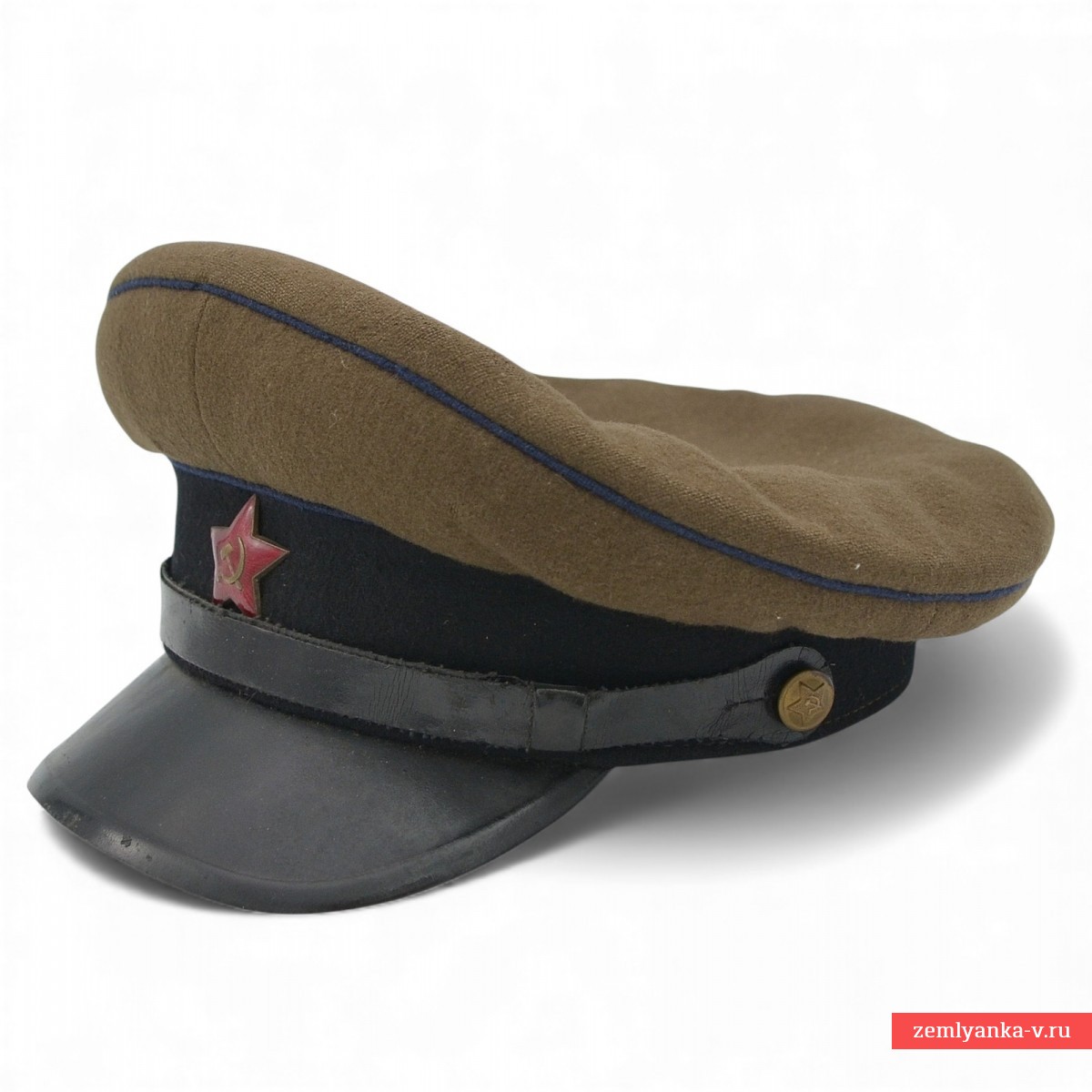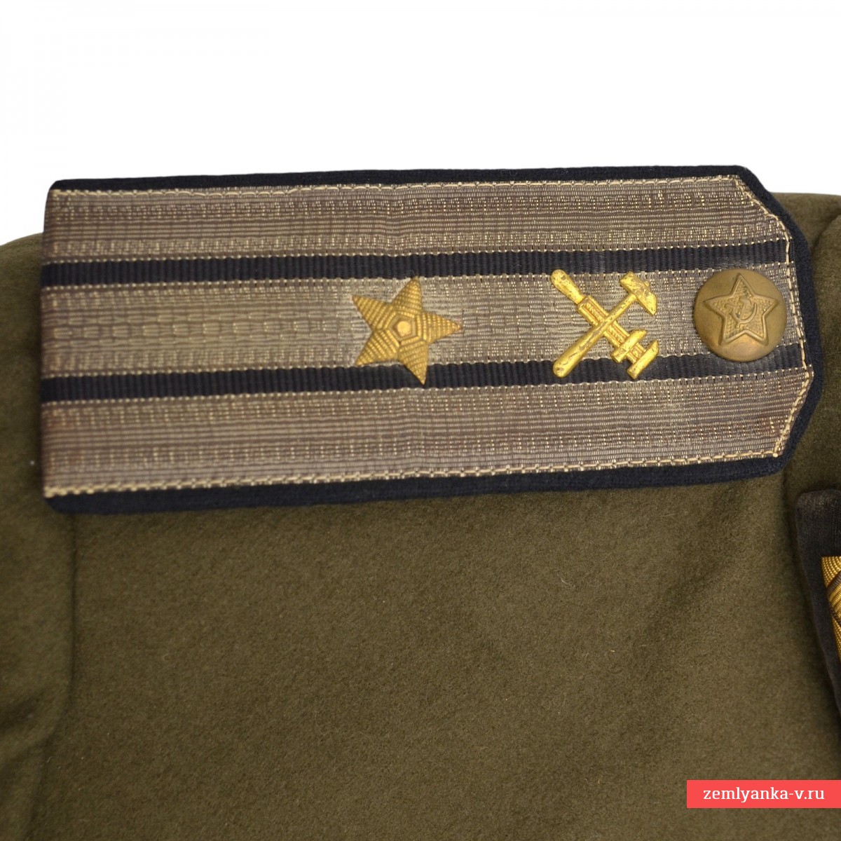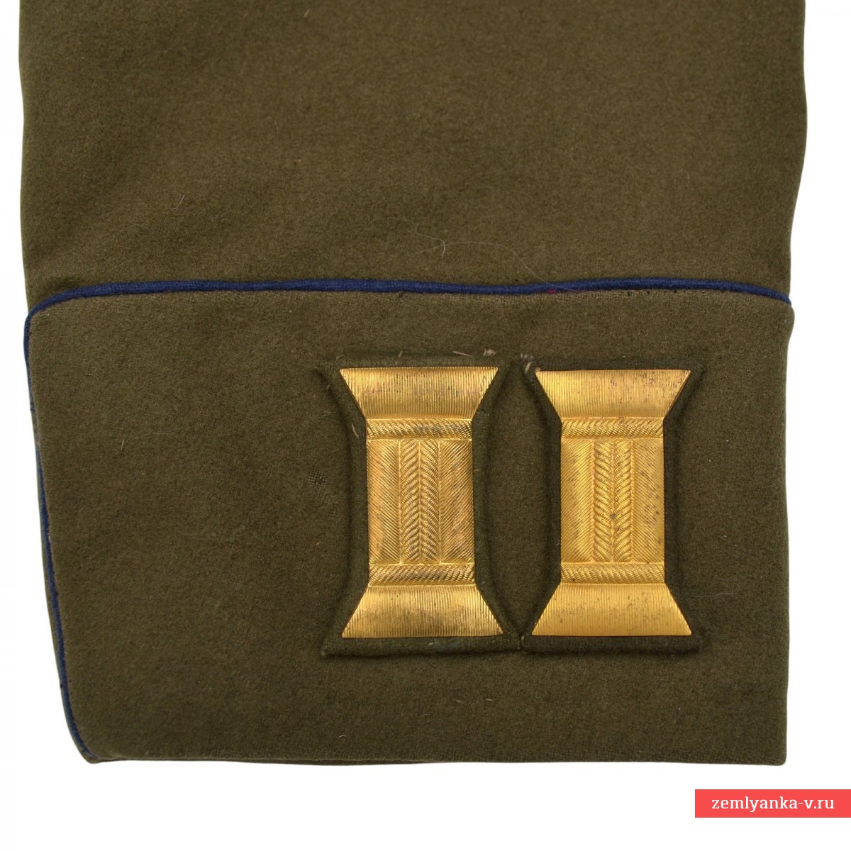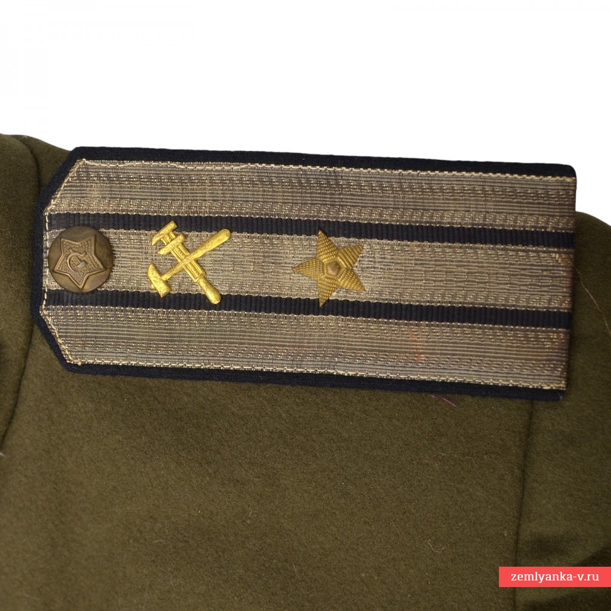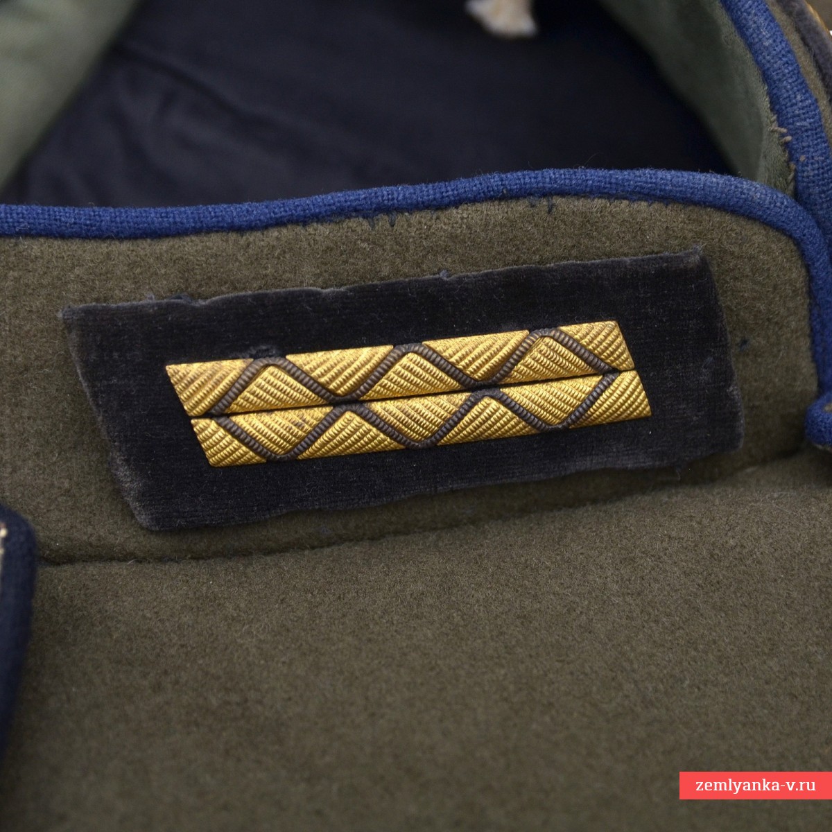 The set includes a dress uniform of the 1943 model and a cap. The uniform is single-breasted, with a cut-off bodice, fastened with five large buttons on the left side. The collar is rigid, stand-up, fastened with two hooks and loops. The upper edge and ends of the collar are trimmed with blue edging. On the collar of the uniform, at an equal distance from its upper and lower edges and 1 cm from the ends, buttonholes (without edging) are sewn from the instrument cloth. The buttonholes have 2 brass gilt strips with black gaps, introduced in 1947. The sleeves of the uniform are double-stitched, with straight side cuffs, edged at the upper edge and ends. There are two brass vertical buttonholes (columns) on the sleeve cuffs, respectively, in accordance with the established shape. There are leaves sewn on the tail of the back, at the ends of which one large button is sewn. Edging along the edge of the left side, collar, leaflet and cuffs, color — according to the type of troops (in our case, blue, corresponding to the engineering troops). All buttons are uniform, brass. The TSUM tag is sewn inside Glavvoentorg. Size 46-48, average height. It was introduced by order of the People's Commissar of Defense of the USSR No. 25 dated January 15, 1943. The uniform is completed with an original cap, sewn at the factory of hats in Moscow. The cap size is 56-57. The belt is not included. Guarantee