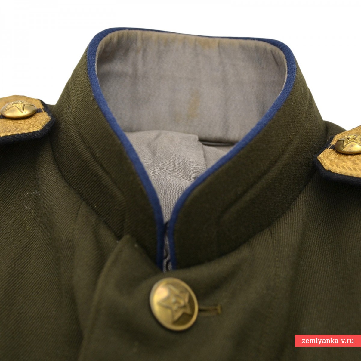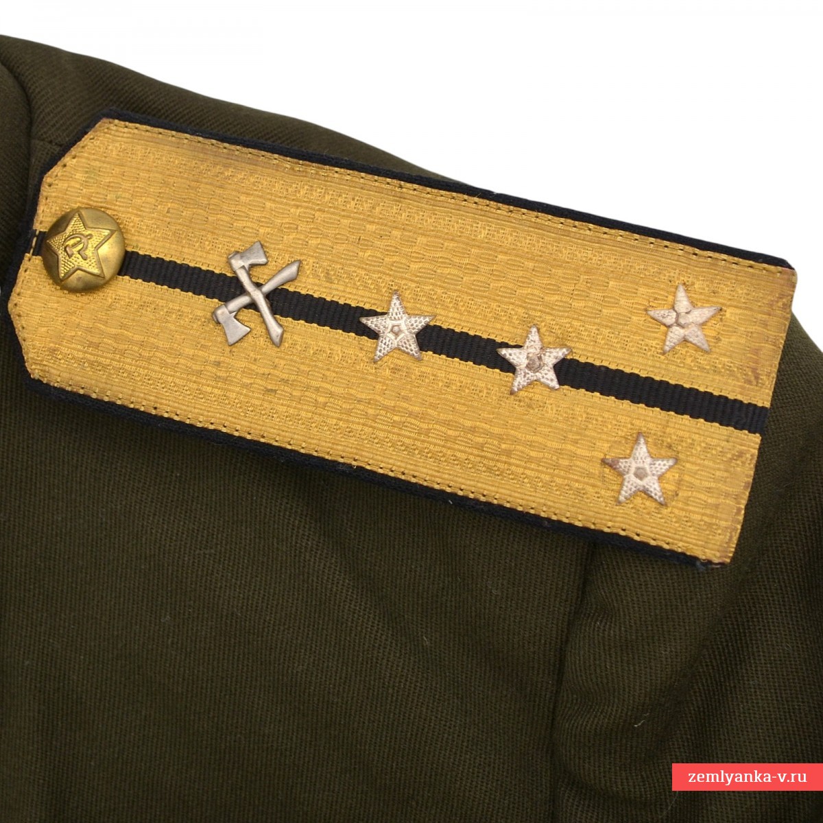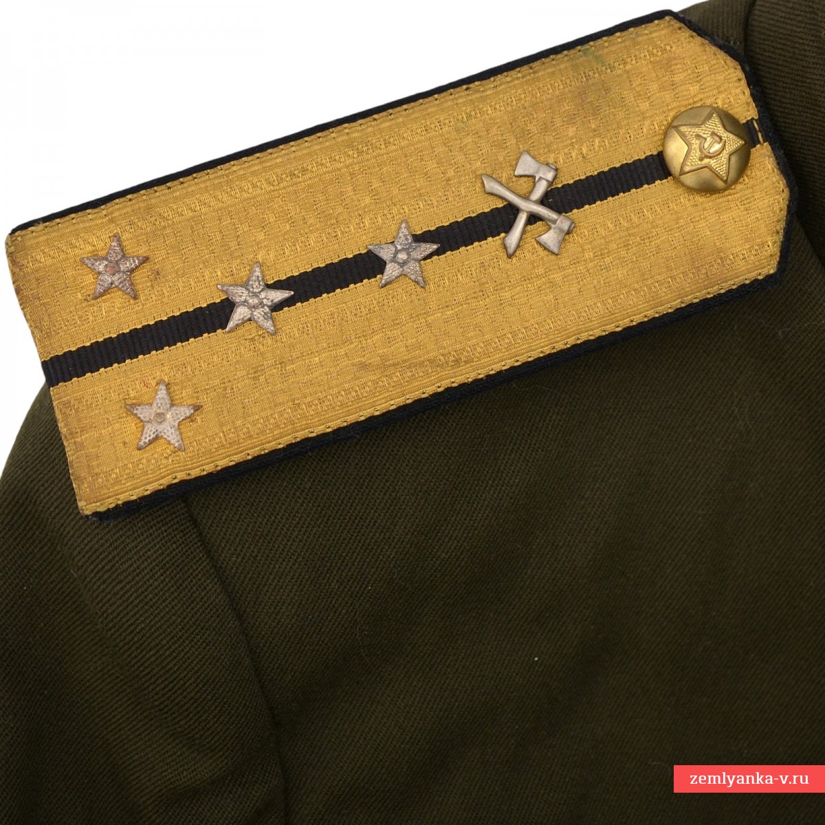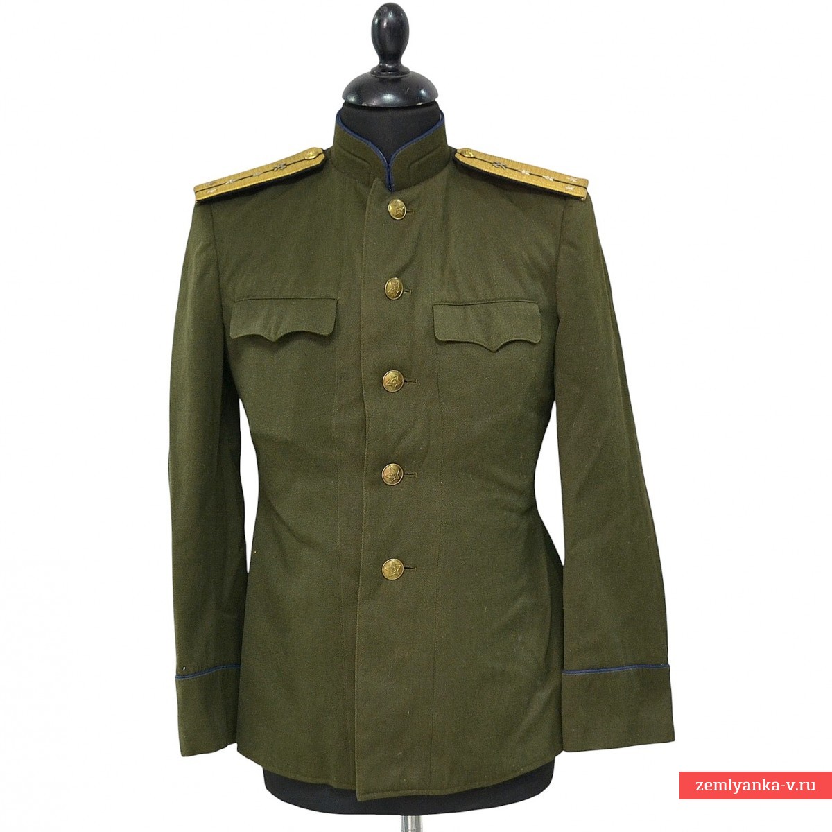 The original tunic is in excellent collector's condition. The tunic is single-breasted, with a cut-off bodice, fastened with five large buttons on the left side. The collar is rigid, stand-up, fastened with two hooks and loops. The upper edge and ends of the collar are trimmed with blue edging. The sleeves are double-stitched, with straight side cuffs, edged at the upper edge and ends. Edging along the edge of the left side, collar, leaflet and cuffs, color — according to the type of troops (in our case, blue, corresponding to the engineering troops). All buttons are uniform, brass. Size 46-48, average height. It was introduced by order of the People's Commissar of Defense of the USSR No. 25 dated January 15, 1943. It is equipped with the everyday shoulder straps of the captain of the sapper units of the 1946 model. Guarantee of authenticity.