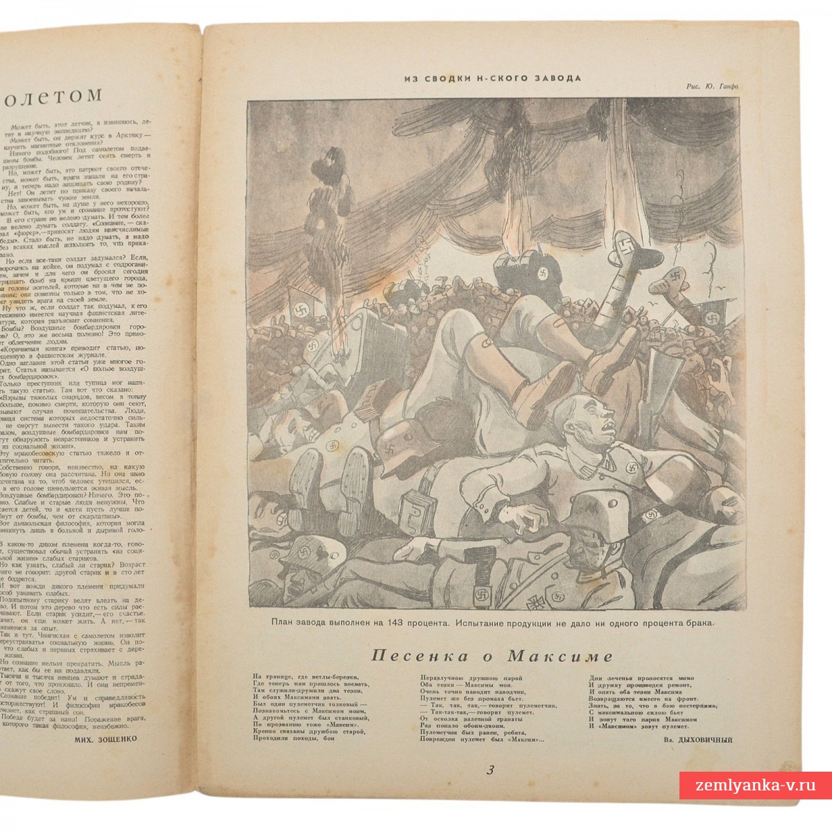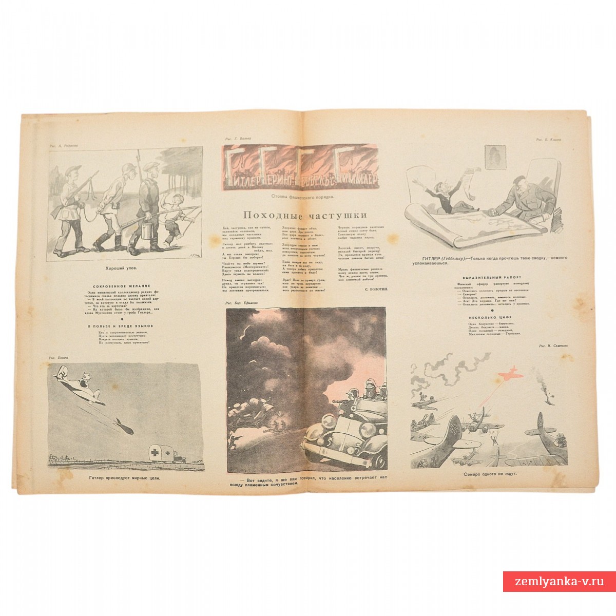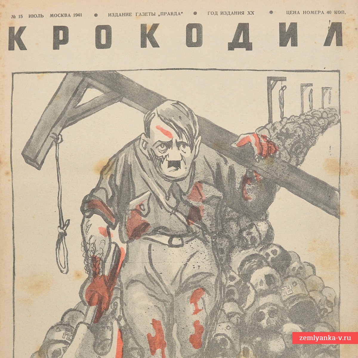 The original magazine is in good collector's condition, tears, dirt, fox spots. Size 34.3 x 26 cm. The publication of the newspaper "Pravda". On the cover is Hitler in the form of a butcher covered in blood, carrying a gallows on his shoulder past a mountain of skulls. The cover was created by legendary Kukryniks (Mikhail Kupriyanov, Porfiry Krylov, Nikolai Sokolov). Color illustrations and caricatures. Guarantee of authenticity.
