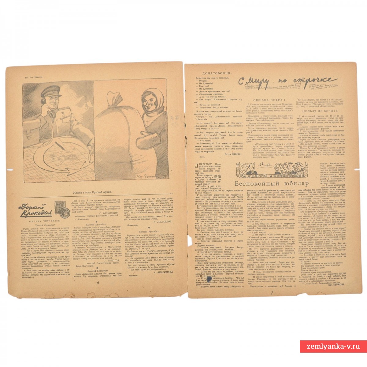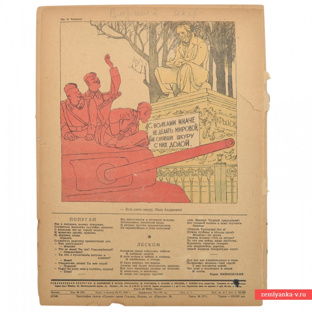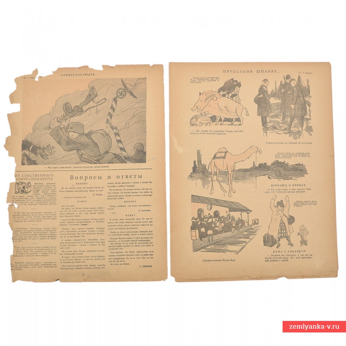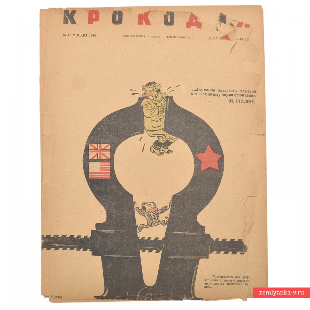 The original magazine is in good collector's condition, tears, dirt, losses, fox spots. The format is 32.7*25.5 cm. The publication of the newspaper "Pravda". The cover depicts a giant vise, where one side is the allies (the flags of the United States and Great Britain), and the other was the USSR (red star). Goebbels is being crushed in a vice, and Hitler is running in panic below. Color illustrations and caricatures. Guarantee of authenticity.