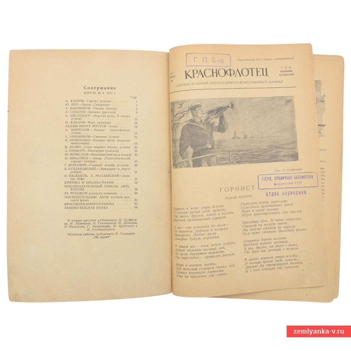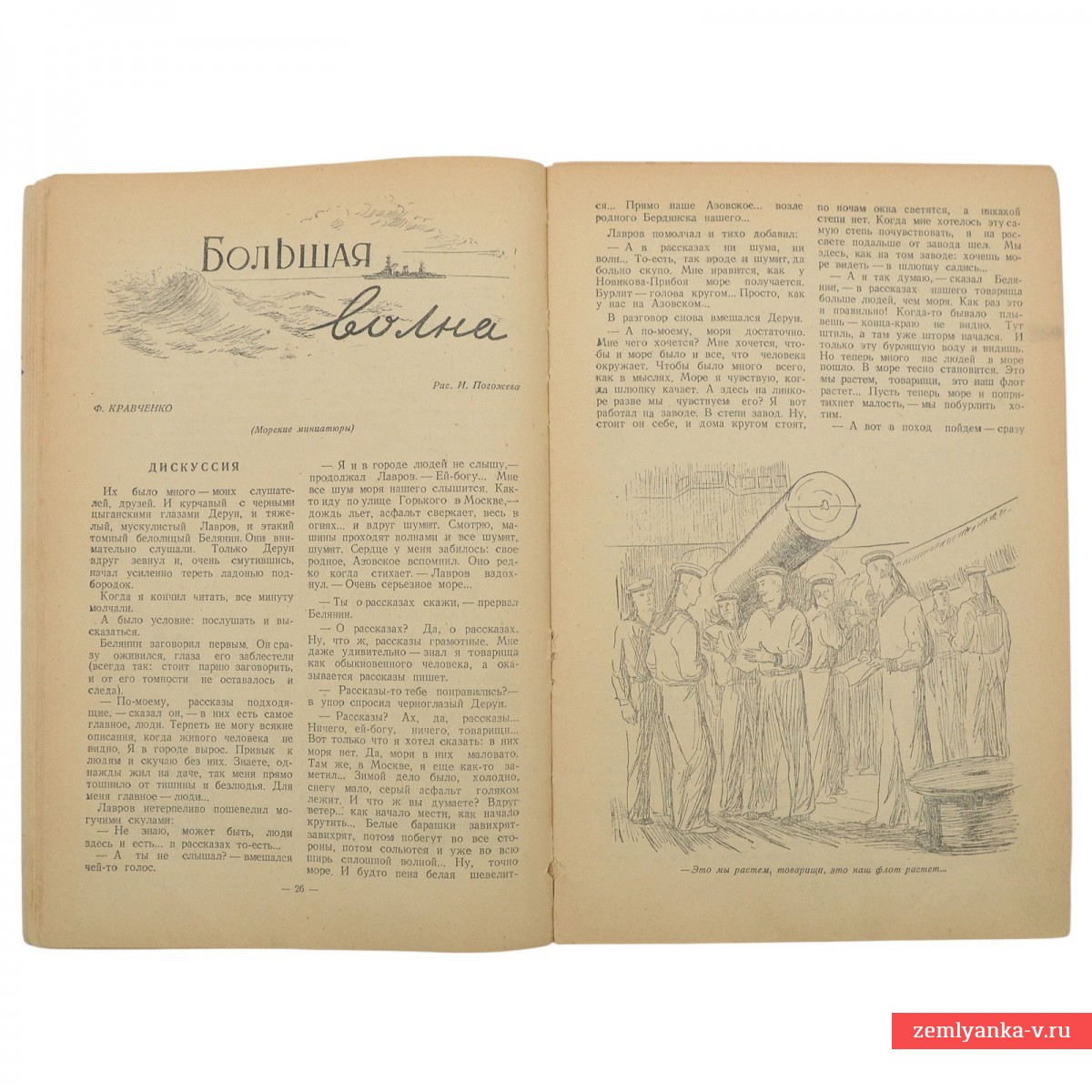 Paper. The magazine is in good collector's condition. The size is 253*174 mm. Color illustrations and caricatures. The cover depicts several warships moored or in the roadstead. Naval flags and signal flags are hoisted on the ships, which gives the scene a solemn look, perhaps a parade or a celebration. A smaller ship is visible in the foreground, and a larger warship is visible behind it. The issue was released shortly before the start of the Great Patriotic War and reflected the pre-war peacetime and the emphasis on the naval power of the USSR. The magazine was literary and artistic, which meant that it contained not only military and propaganda materials, but also short stories, essays, and poems. Guarantee of authenticity.