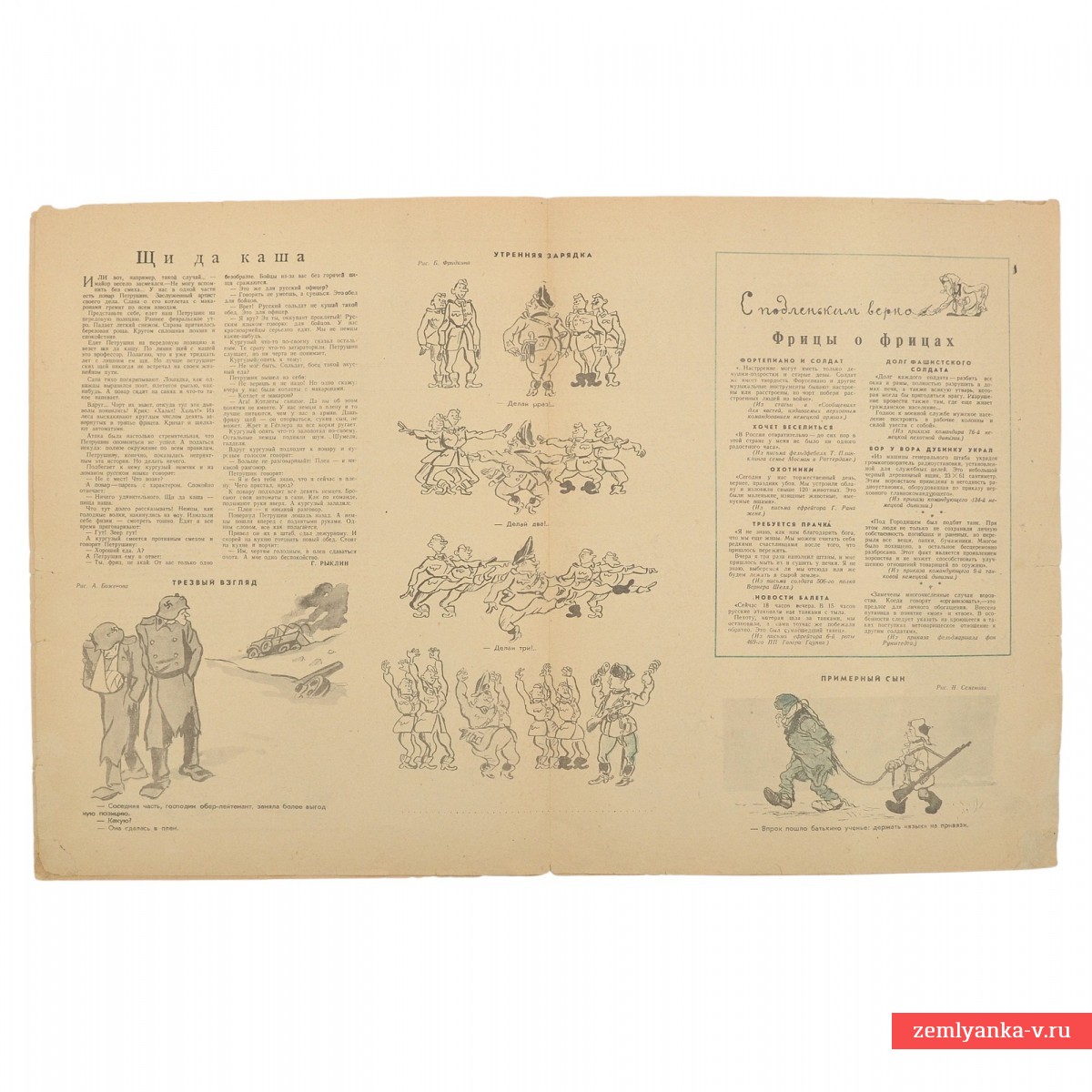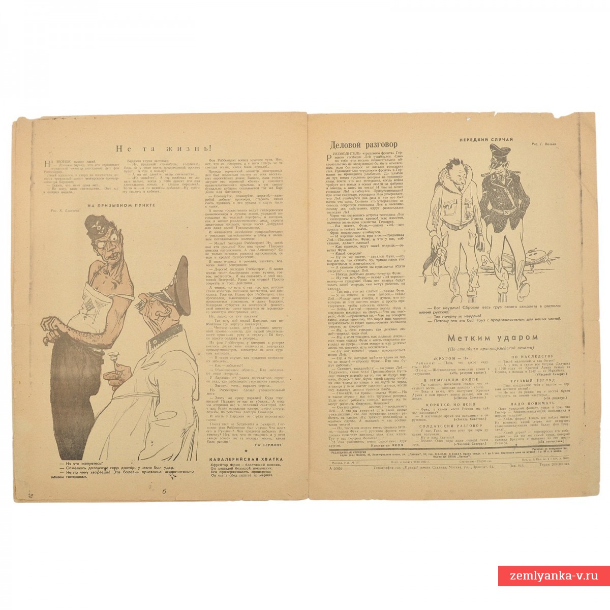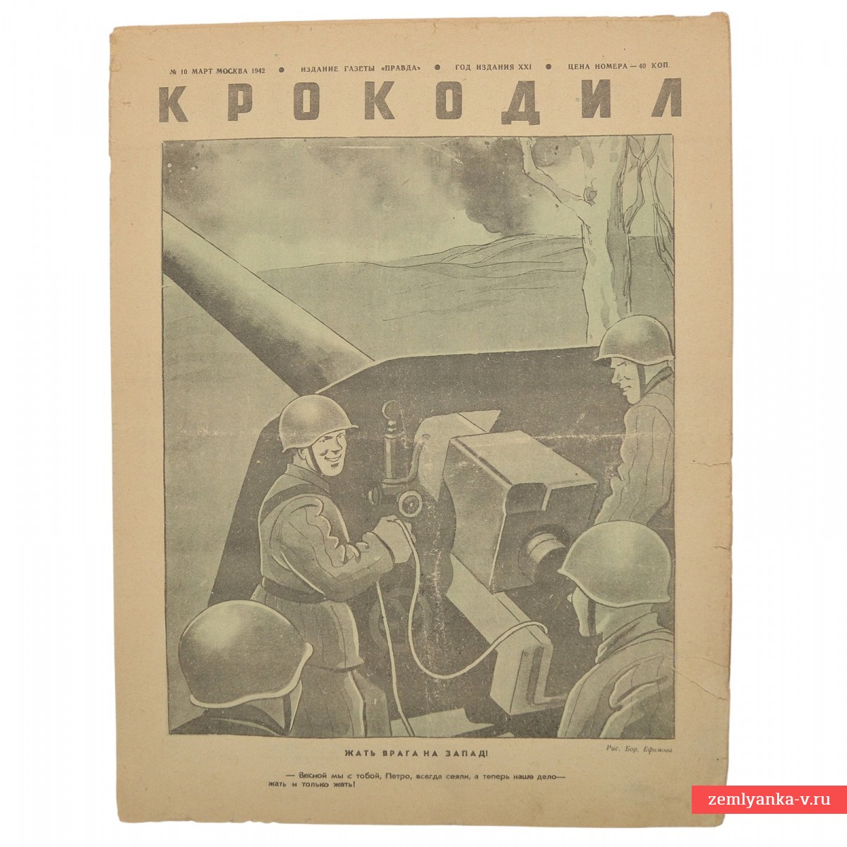 Paper. The magazine is in good collector's condition. The size is 340*254. Color illustrations and caricatures. The cover depicts Soviet soldiers of the Red Army firing artillery from a cannon. The main headline on the cover reads: "PRESS THE ENEMY TO THE WEST!". A dialogue is given under the main drawing: "In the spring, Petro, you and I always sowed, and now our job is to reap and only reap!". The cover bears a pronounced agitation character, calling for active action against the enemy and using the image of the harvest to enhance the emotional impact on the reader. Guarantee of authenticity.