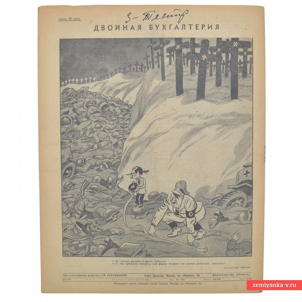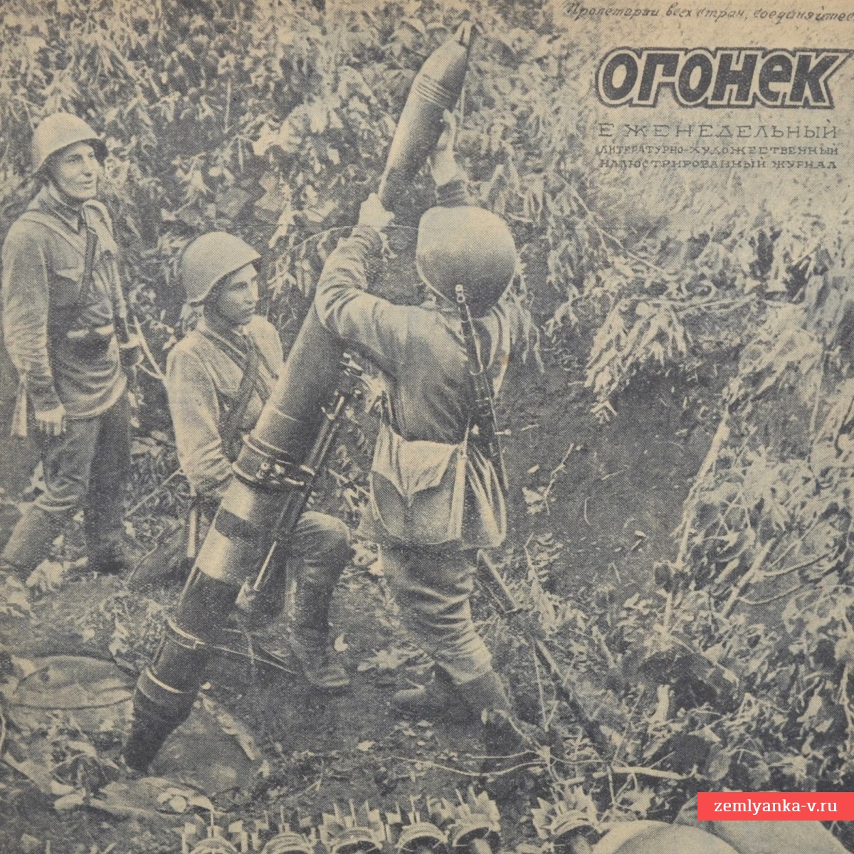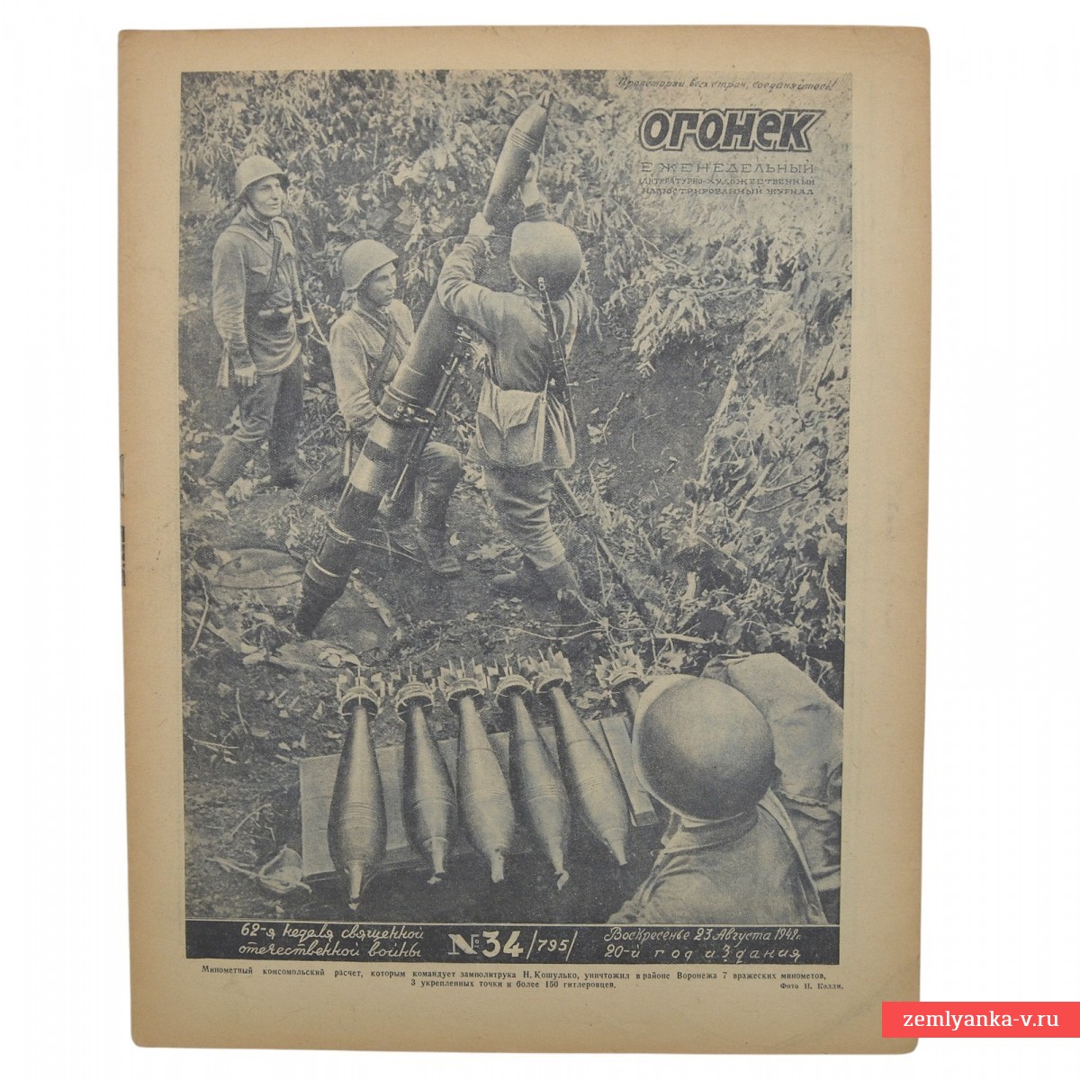 The original magazine is in good collector's condition. The cover depicts a mortar Komsomol crew under the command of junior political officer N. Koshulko, firing at the enemy in the area Voronezh. According to the caption, the calculation destroyed 7 enemy mortars, 3 fortified points and more than 150 Nazis in the area. The author of the picture is photojournalist P. Kozlov. In the summer of 1942, fierce fighting took place in the Voronezh region. The city was of strategic importance, as it divided the front line into two parts; the right bank was occupied, and Soviet troops defended the left bank. The format is 270*340 mm. Black and white illustrations. Minor damage to the root. Complete set. Guarantee of authenticity.