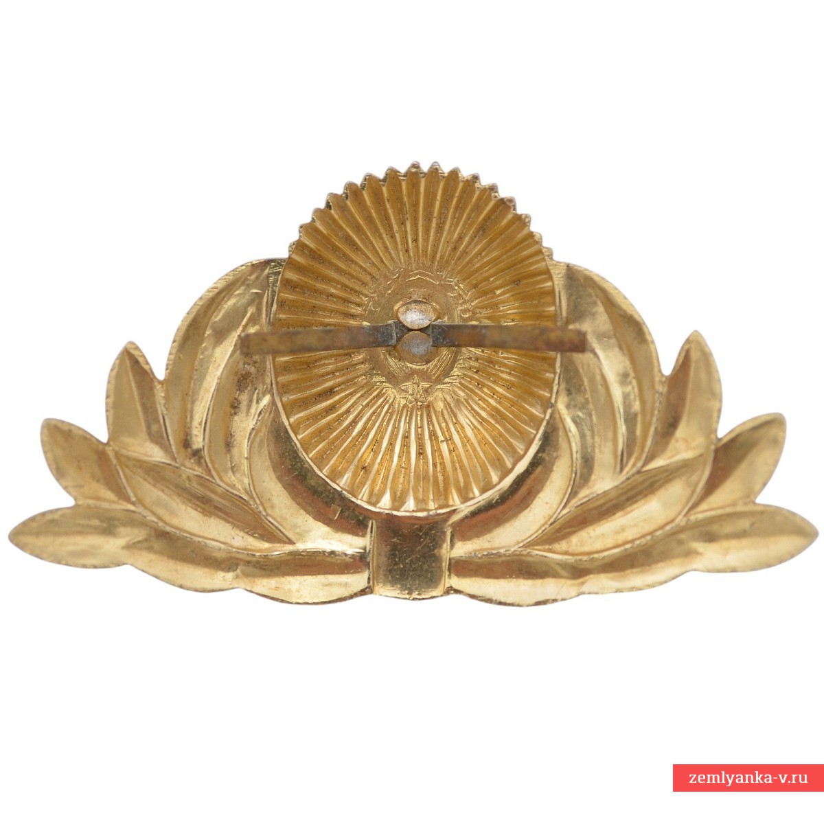 The original cockade is in excellent unworn condition. Original mustache fastener. The cockade is metal, all—stamped, in the form of a convex, oval rosette of golden color, in the center of which is the coat of arms of the USSR; the ribbon and the star of the coat of arms are lined with red enamel, the globe with blue enamel. The coat of arms of the USSR is framed by a rim lined with red enamel. From the rim to the edges, the cockade has a polished corrugated surface. In the center of the reverse side of the cockade is a clip for attachment to the headdress. The badge on the cap is metallic, golden in color, in the form of a wreath of laurel leaves tied with a ribbon at the bottom. Introduced by Order of the Ministry of Internal Affairs USSR No. 230 dated 3.06. 1969. Guarantee of authenticity.